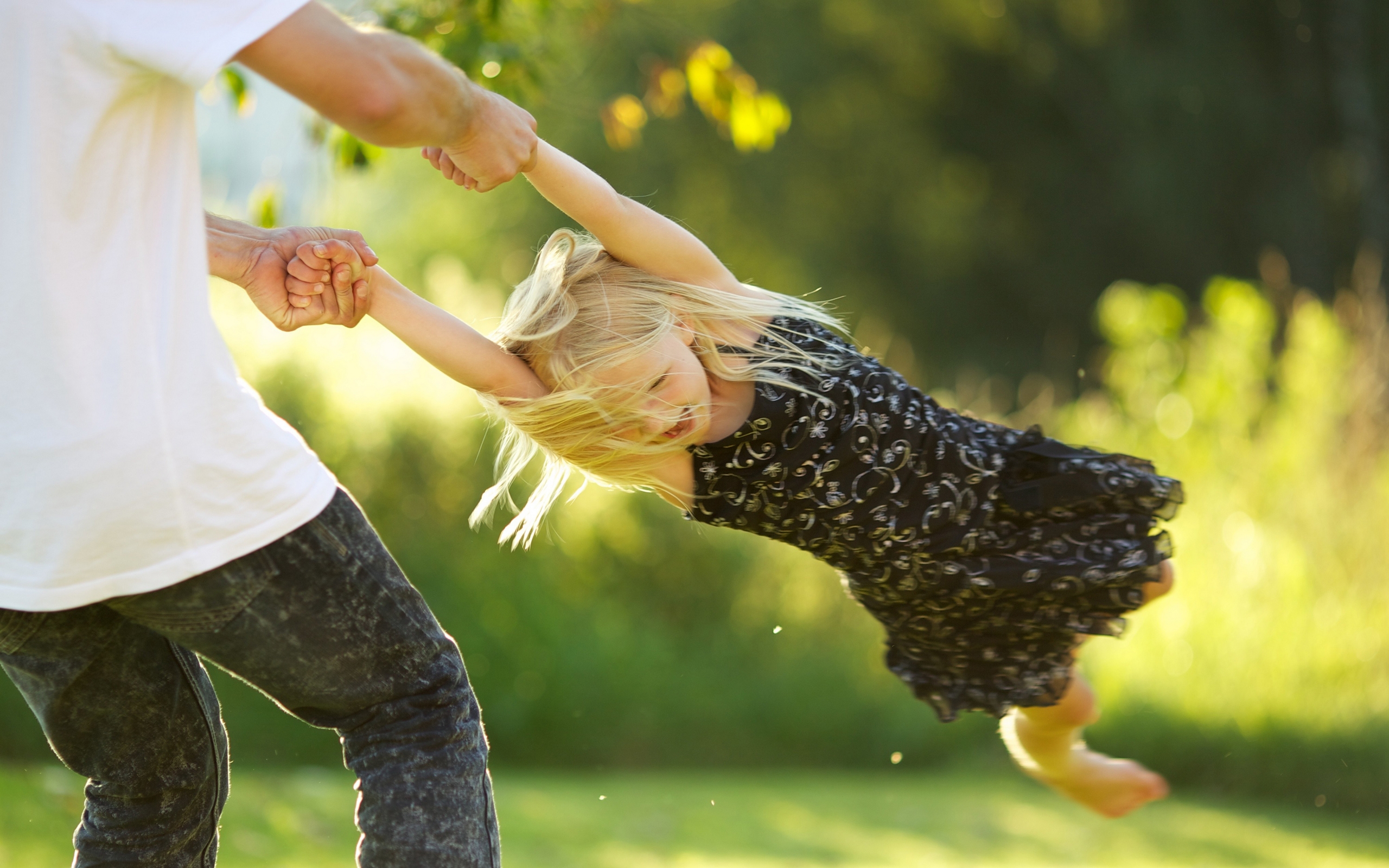 Description: A little girl is jumping in the air with her father's hands behind her and a skateboard in the air.