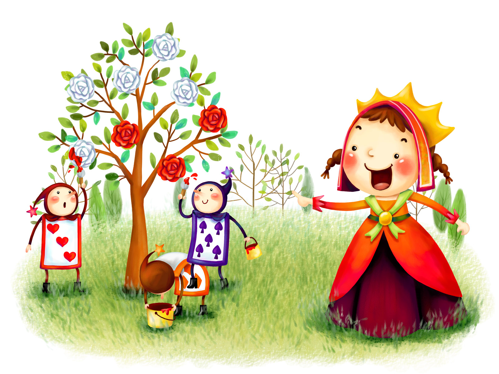 Description: A little girl in a red dress standing next to a tree with a crown on it and a little boy in a red dress.