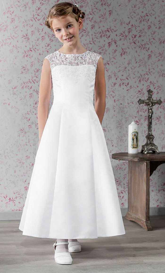 Description: A little girl in a white dress standing in front of a wall with a pink flower on it and a cross on the floor.