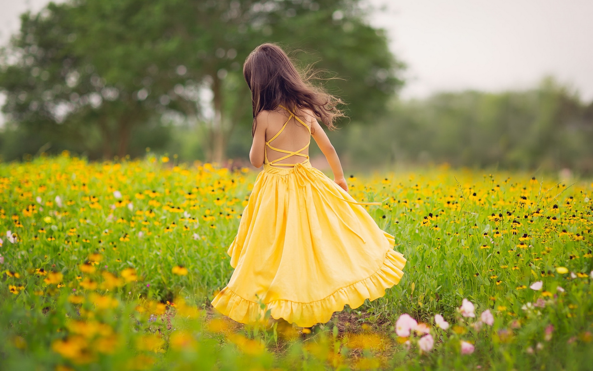Description: A little girl in a yellow dress walking through a field of flowers and grass with a tree in the background.