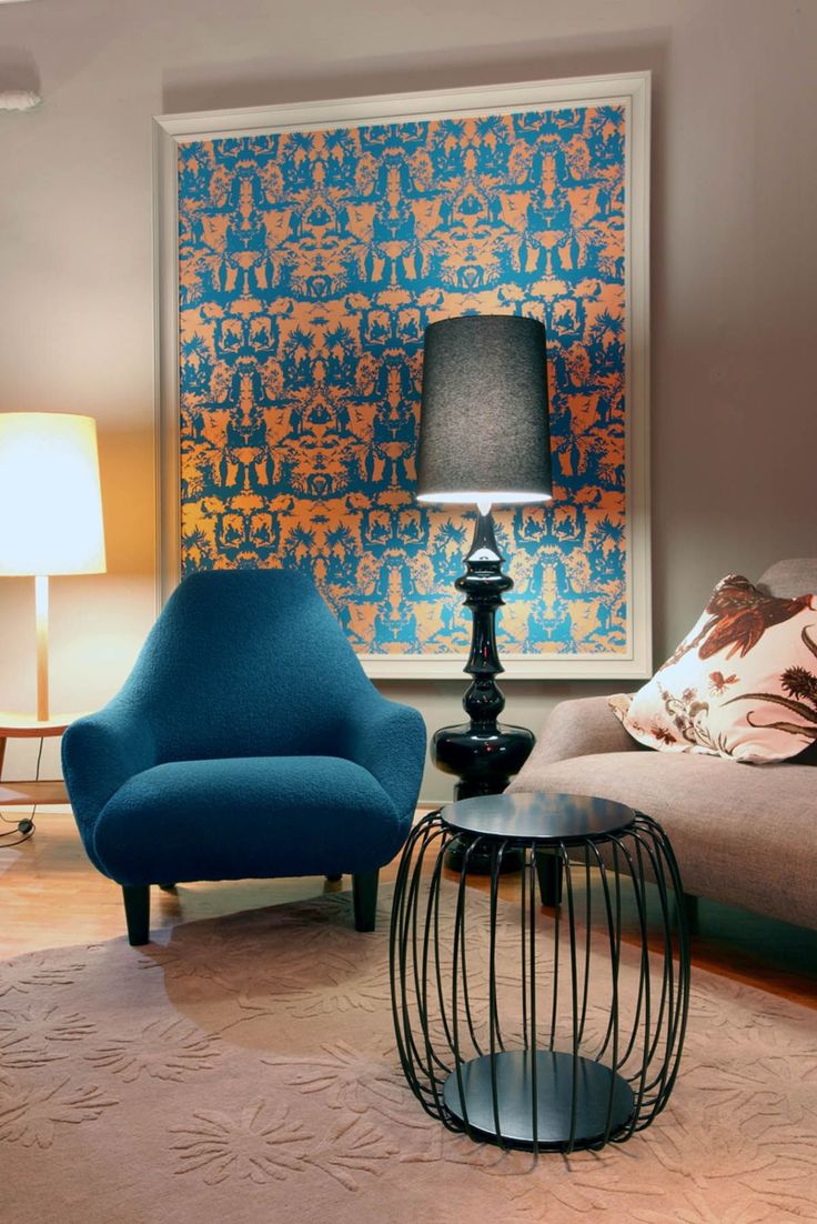 Description: A living room with a blue chair and a blue lamp in it and a blue chair and a blue lamp on a table.