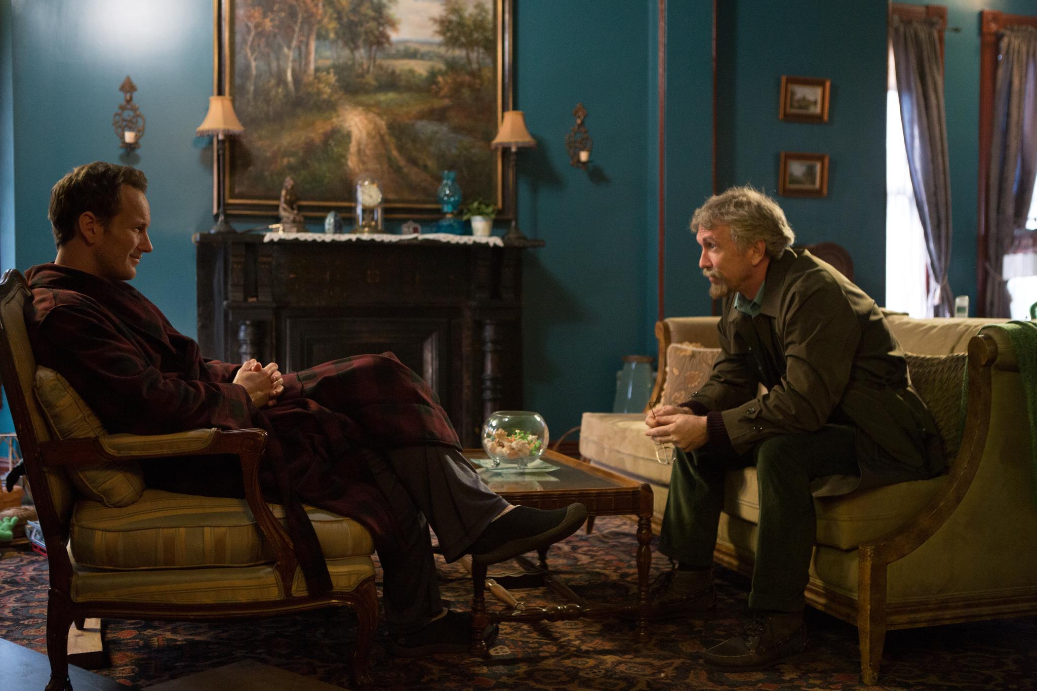 Description: A man sitting in a chair next to another man in a living room with a fireplace and a painting on the wall.
