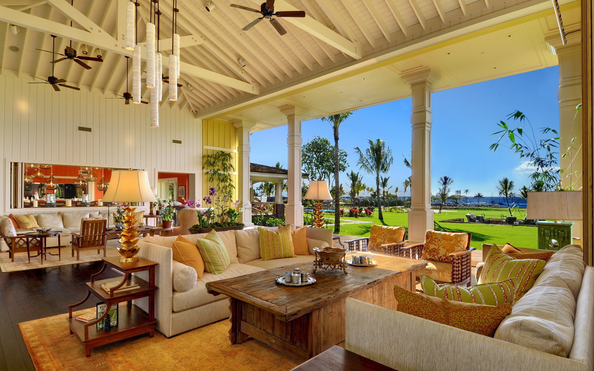 Description: A living room with a ceiling fan and a large window overlooking a golf course and ocean with palm trees.