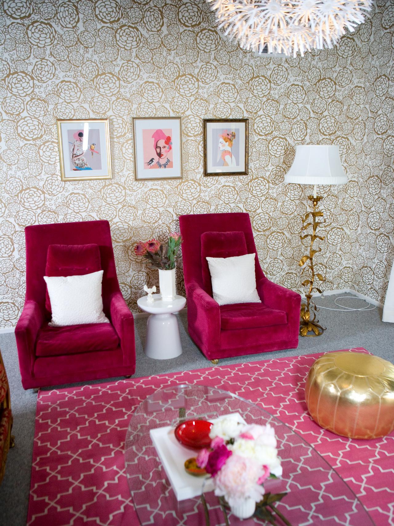 Description: A living room with two chairs and a table with a vase of flowers on it and a chandelier.
