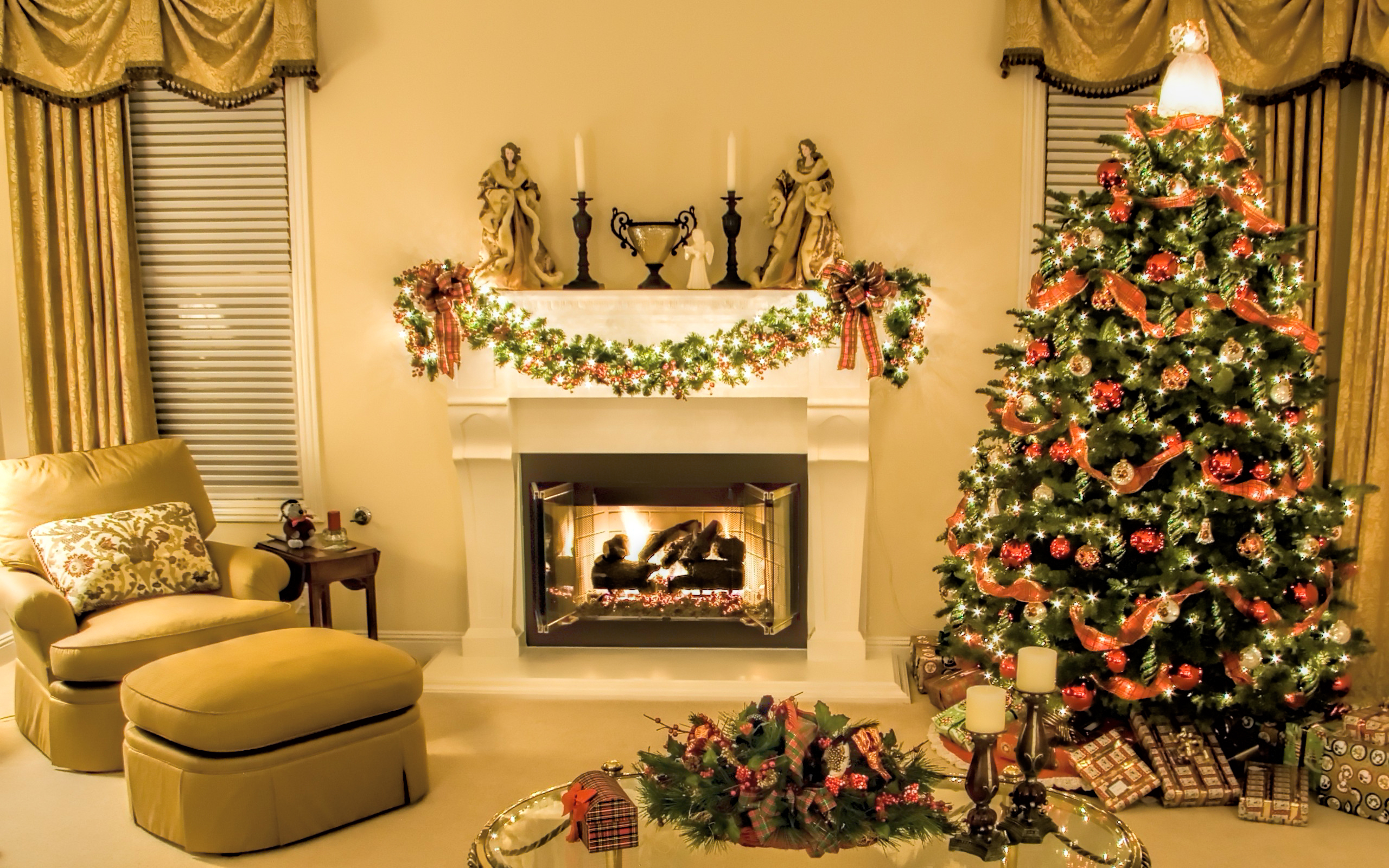Description: A living room with a christmas tree and a fire place in it's centerpieces and a couch.