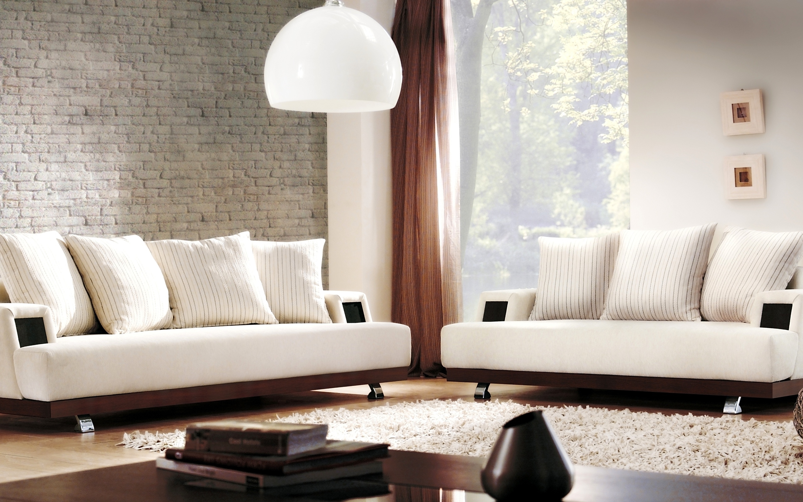 Description: A living room with a couch and a chair in it and a lamp hanging over the couch and a table.