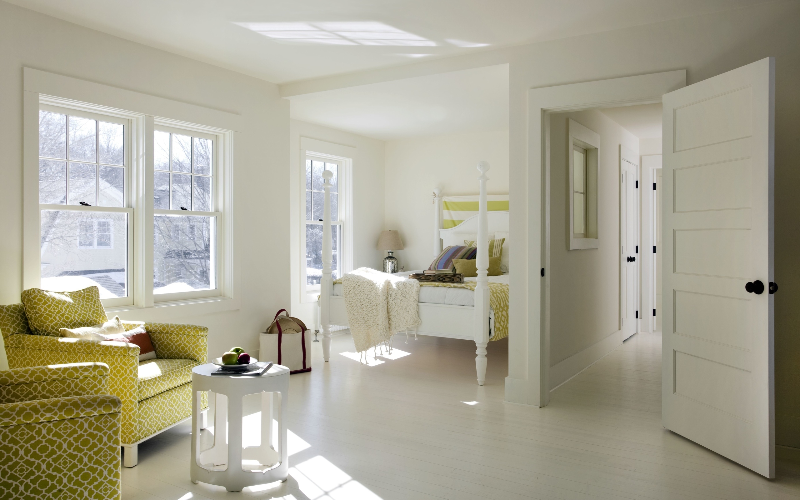 Description: A living room with a couch and a chair in it and a table with a lamp on it and a door leading to another room.