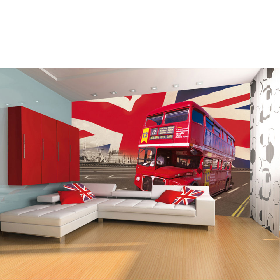 Description: A living room with a couch and a large mural of a bus on the wall and a red cabinet.
