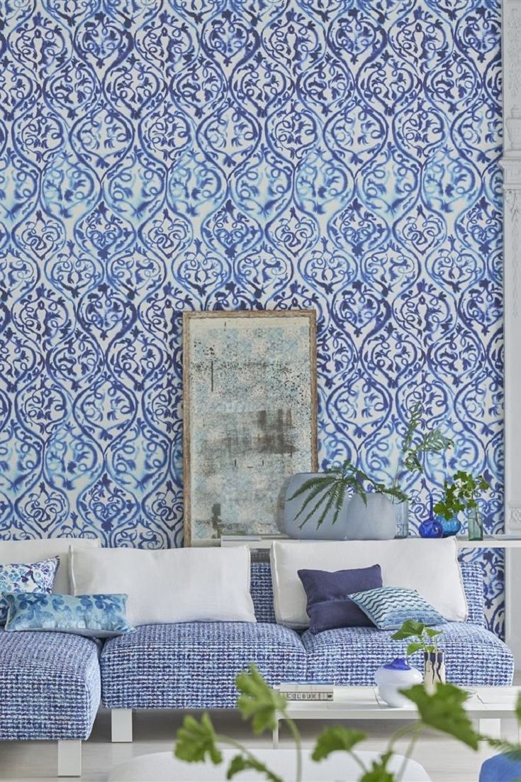 Description: A living room with a couch and a painting on the wall behind it and a plant in the corner.