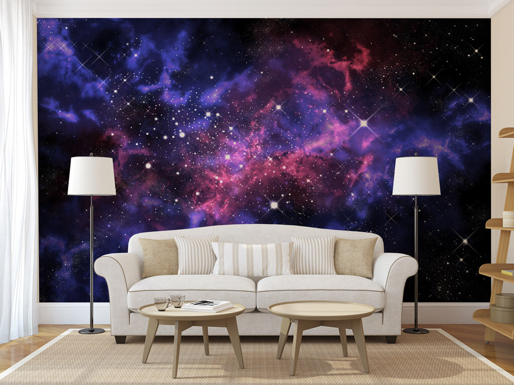 Description: A living room with a couch and a table in front of a wall mural of a star cluster and a purple and blue galaxy.
