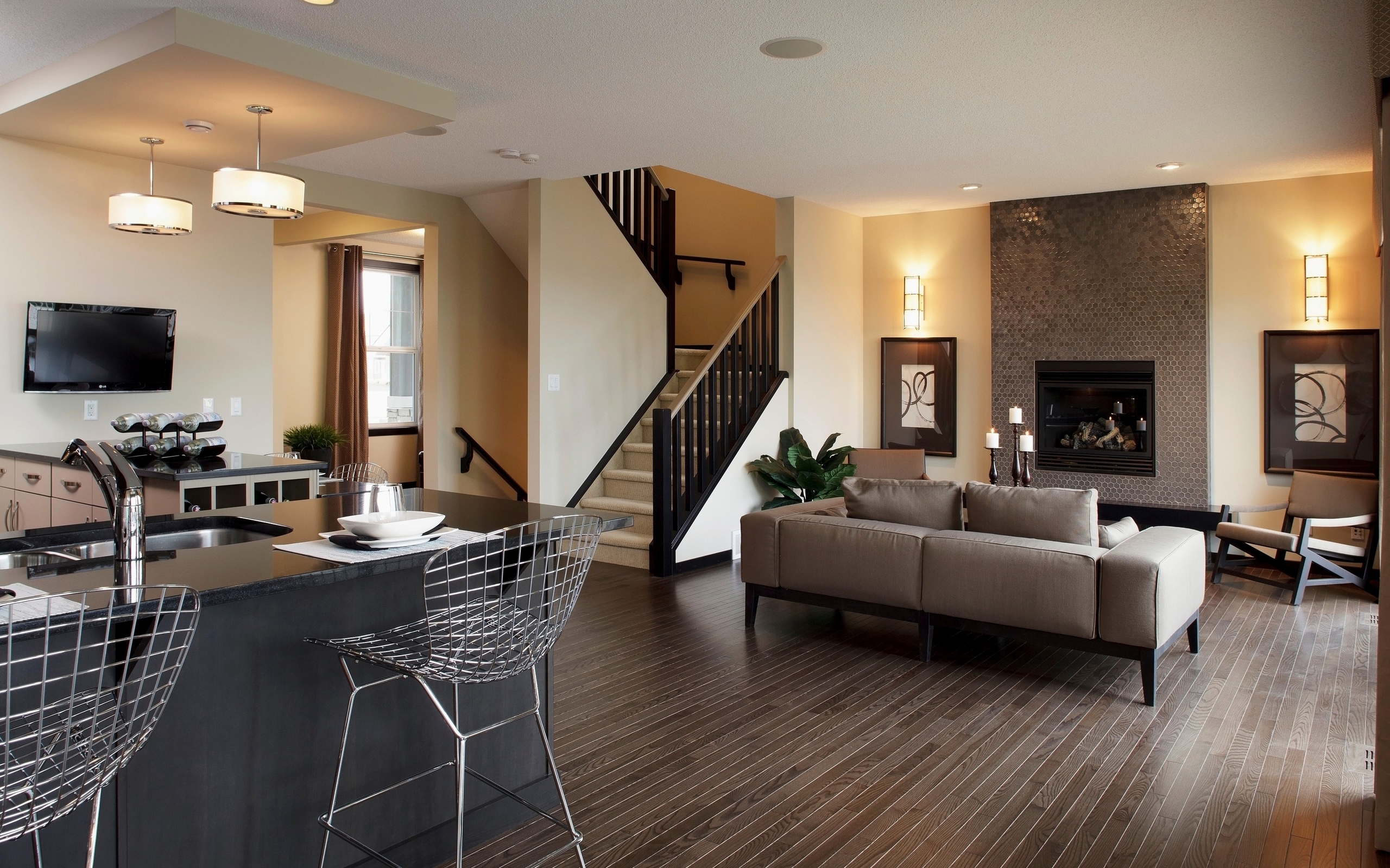 Description: A living room with a couch a table and a tv on a wall and a staircase in the background.