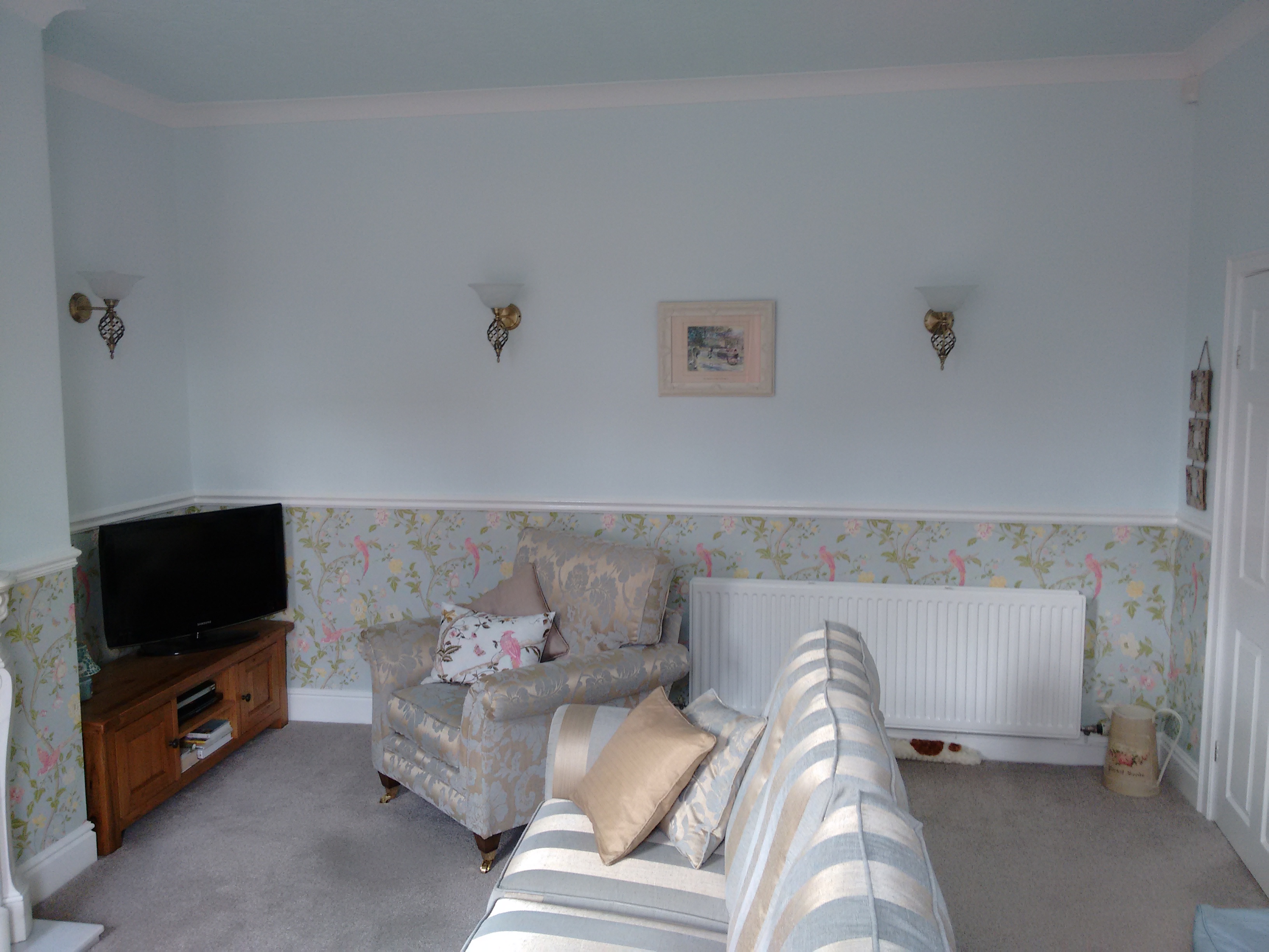 Description: A living room with a couch and a television on a stand in it's corner area with a striped couch and a striped chair.