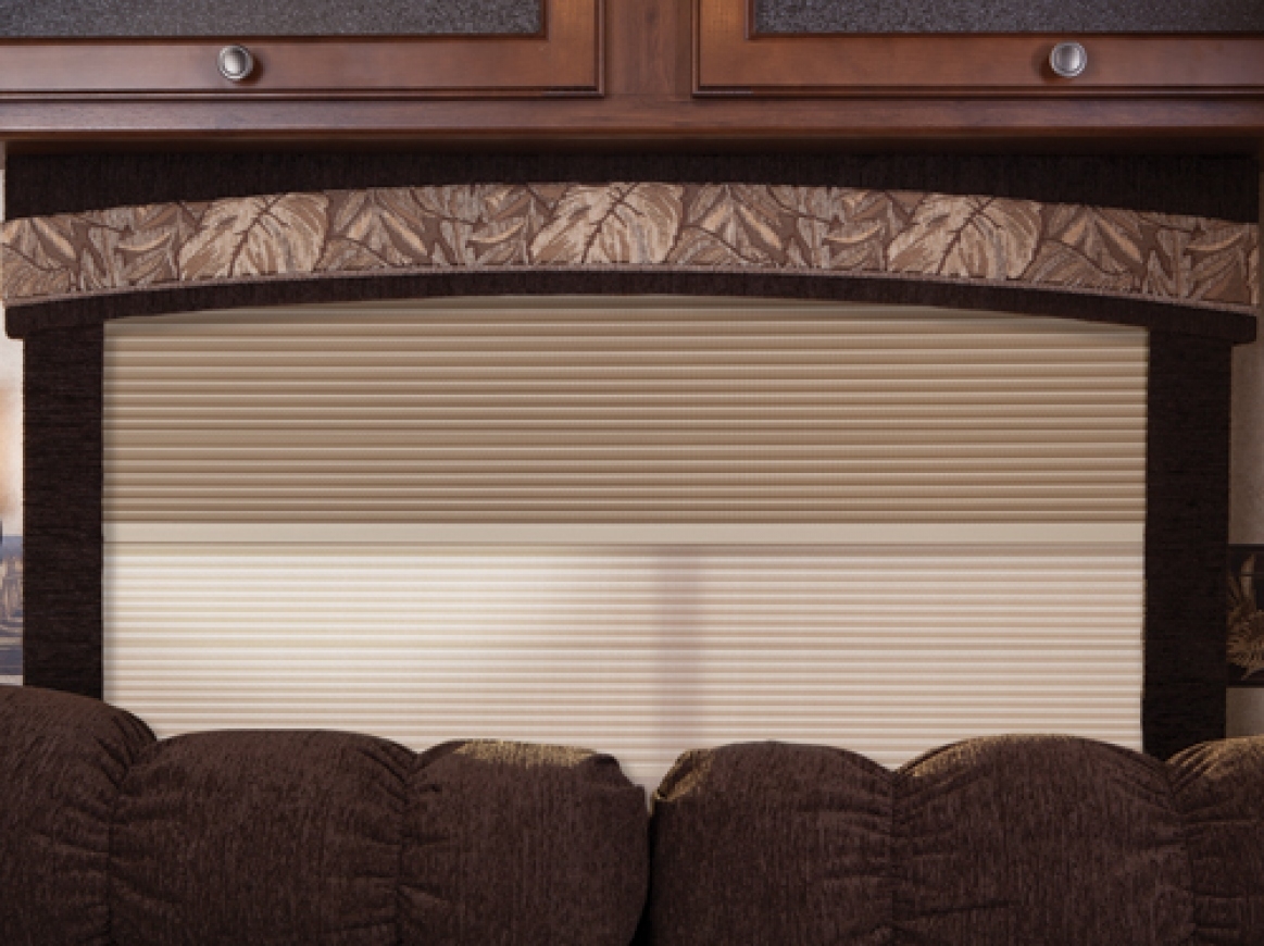 Description: A living room with a couch and a window with a blind in it's center area and a cat sitting on the couch.