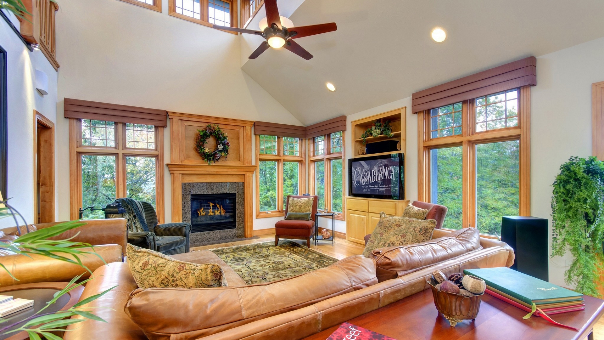 Description: A living room with a fireplace and a large couch in it's center area with a tv on the wall.