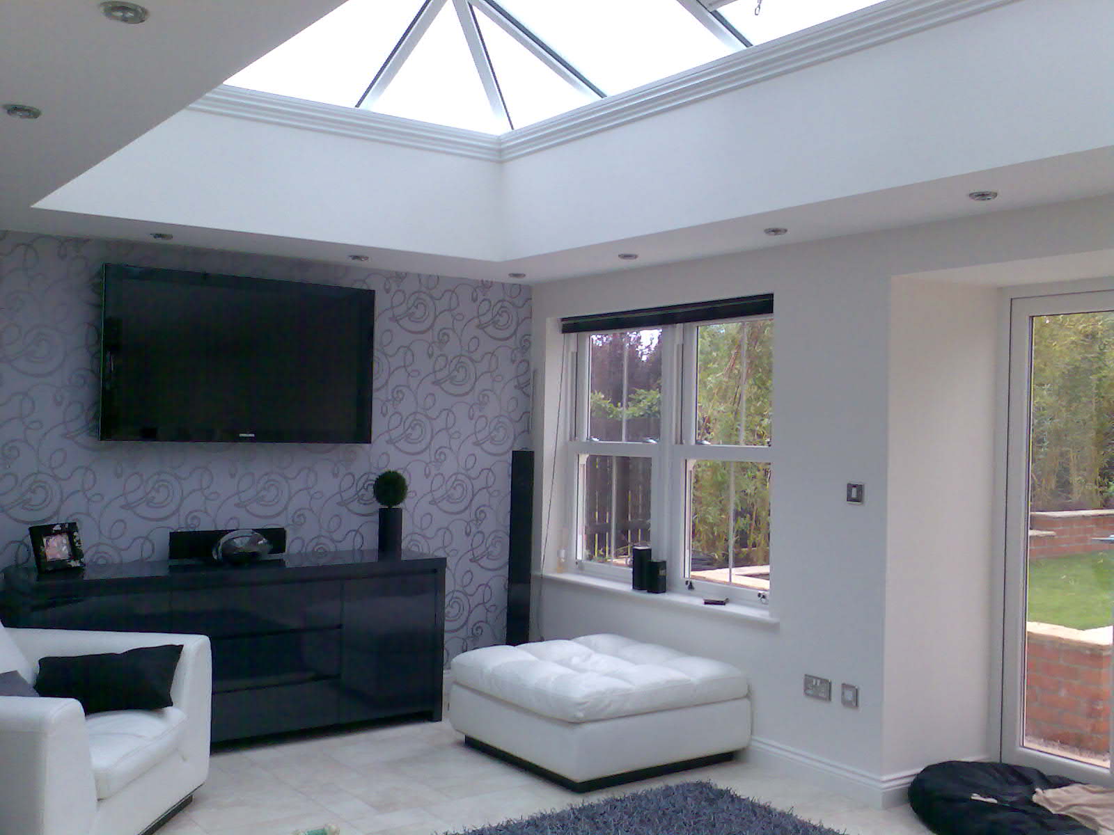 Description: A living room with a flat screen tv and a white couch and ottomans in front of a window.