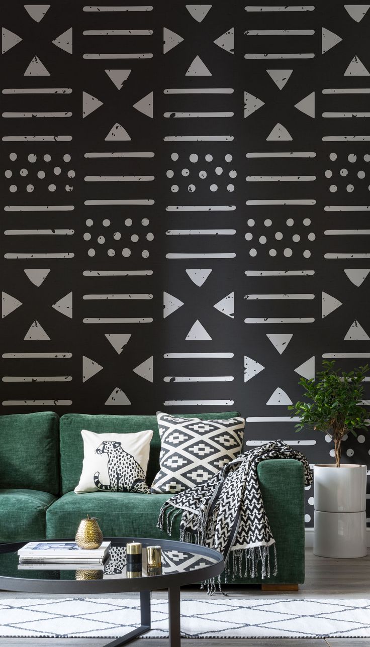 Description: A living room with a green couch and a black wall with white geometric designs on it and a coffee table.