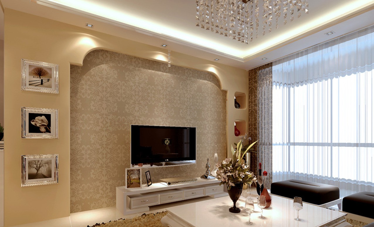 Description: A living room with a large tv and a chandelier hanging from the ceiling and a chandelier hanging from the ceiling.