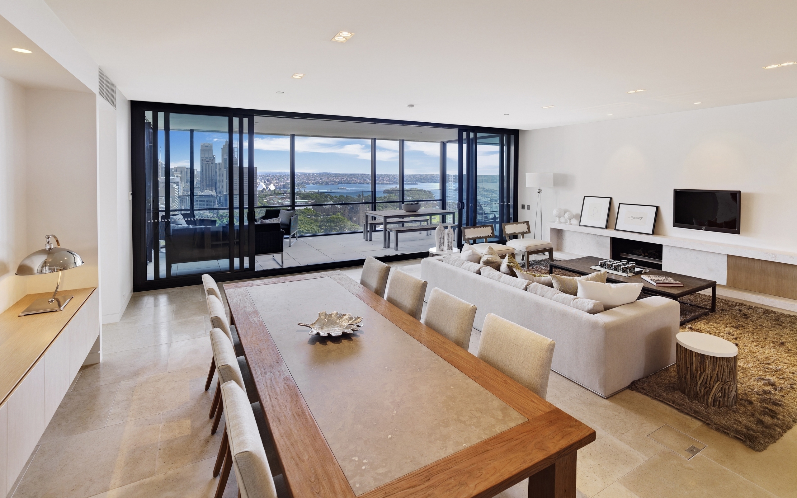 Description: A living room with a large window and a table with chairs and a couch in it and a television on the wall.