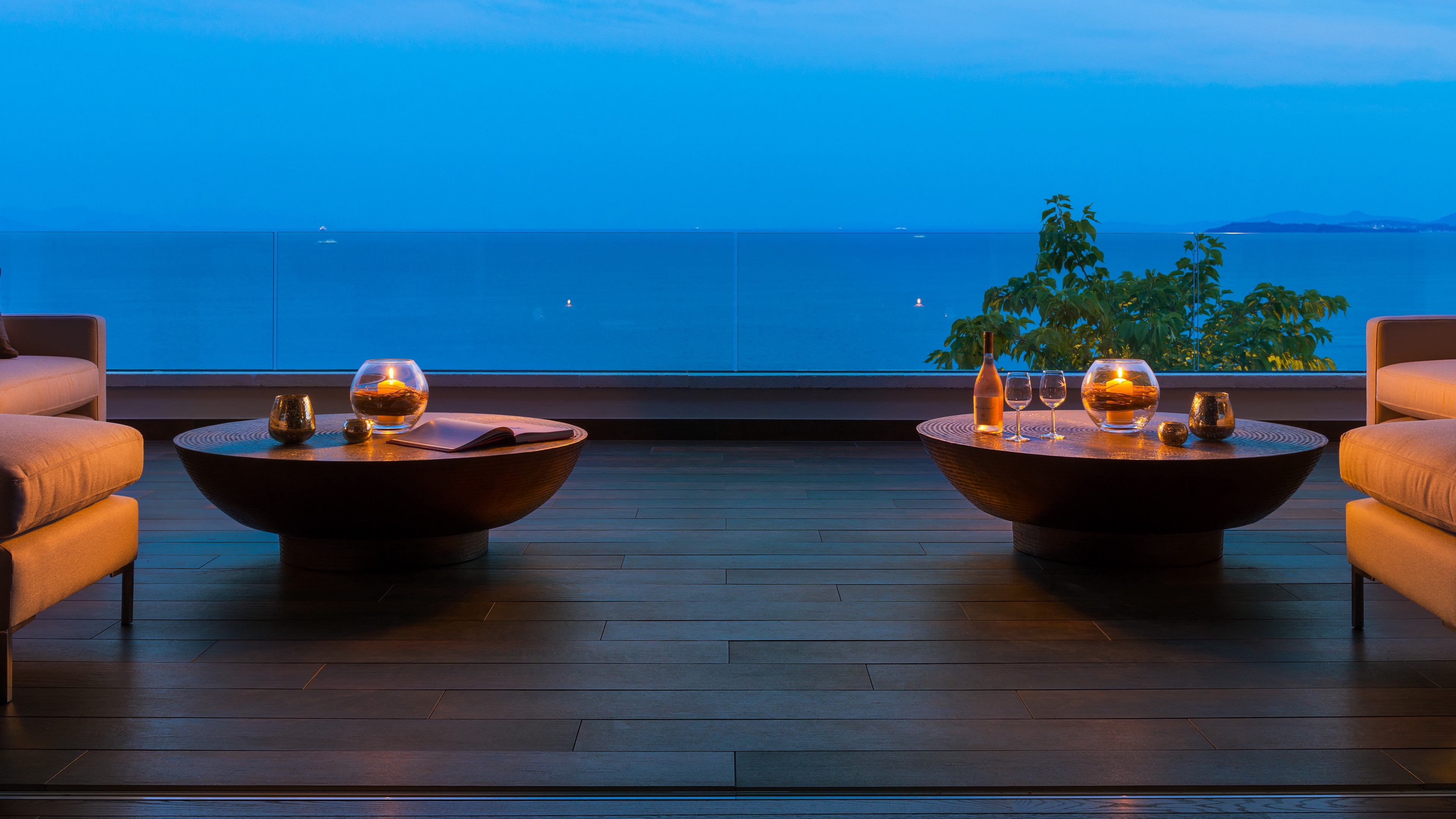 Description: A living room with a view of the ocean at night time with candles on the table and two chairs.