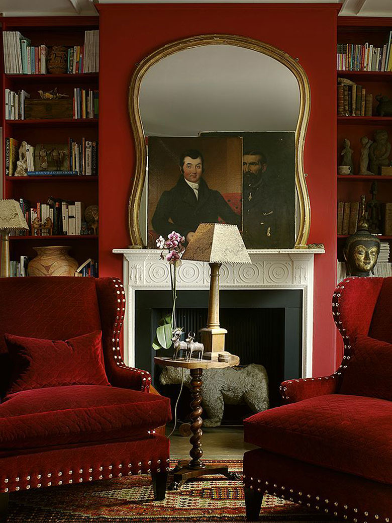 Description: A living room with a red couch and a chair and a painting on the wall behind it and a fireplace.