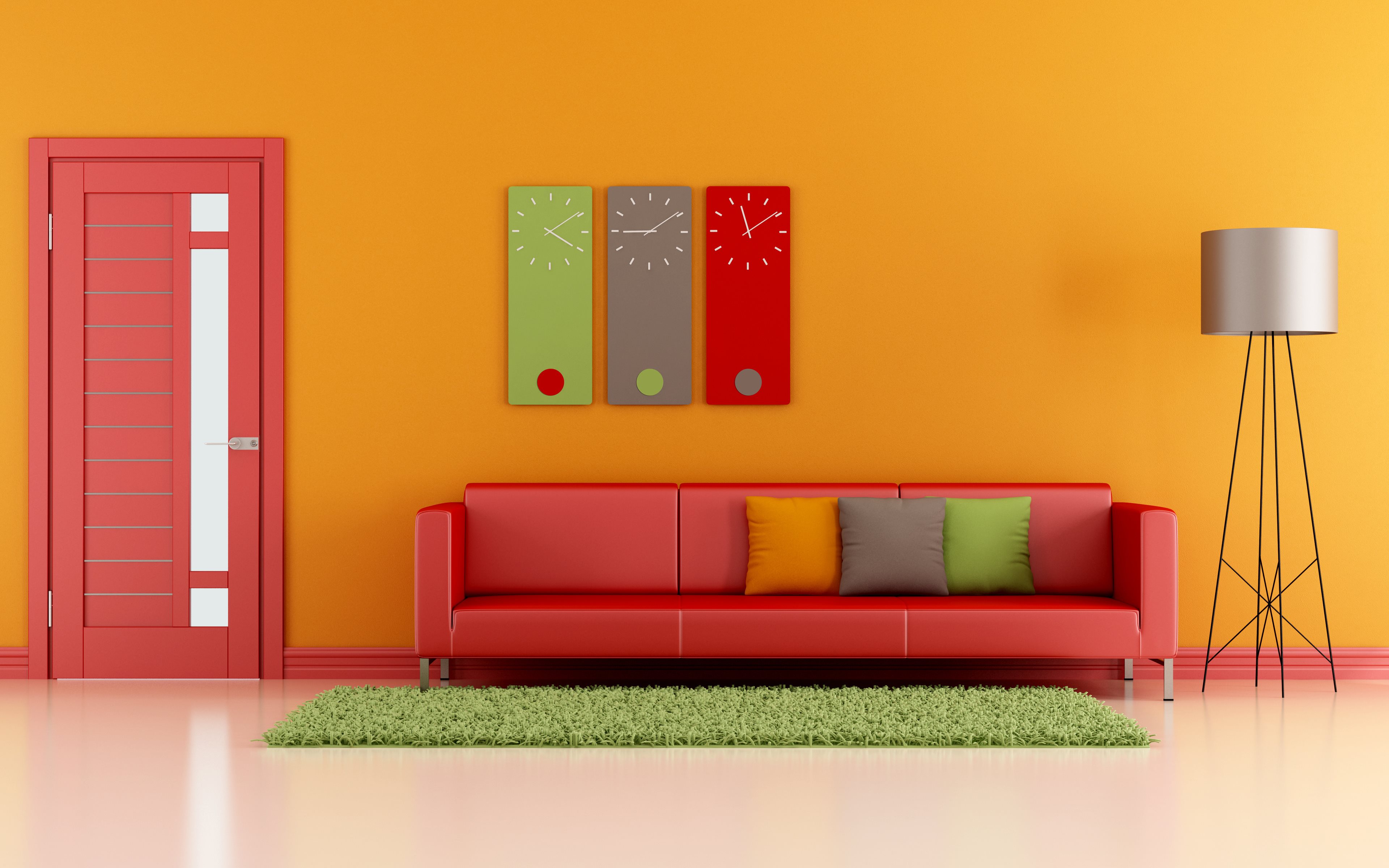 Description: A living room with a red couch and a green rug on the floor and a red door on the wall.