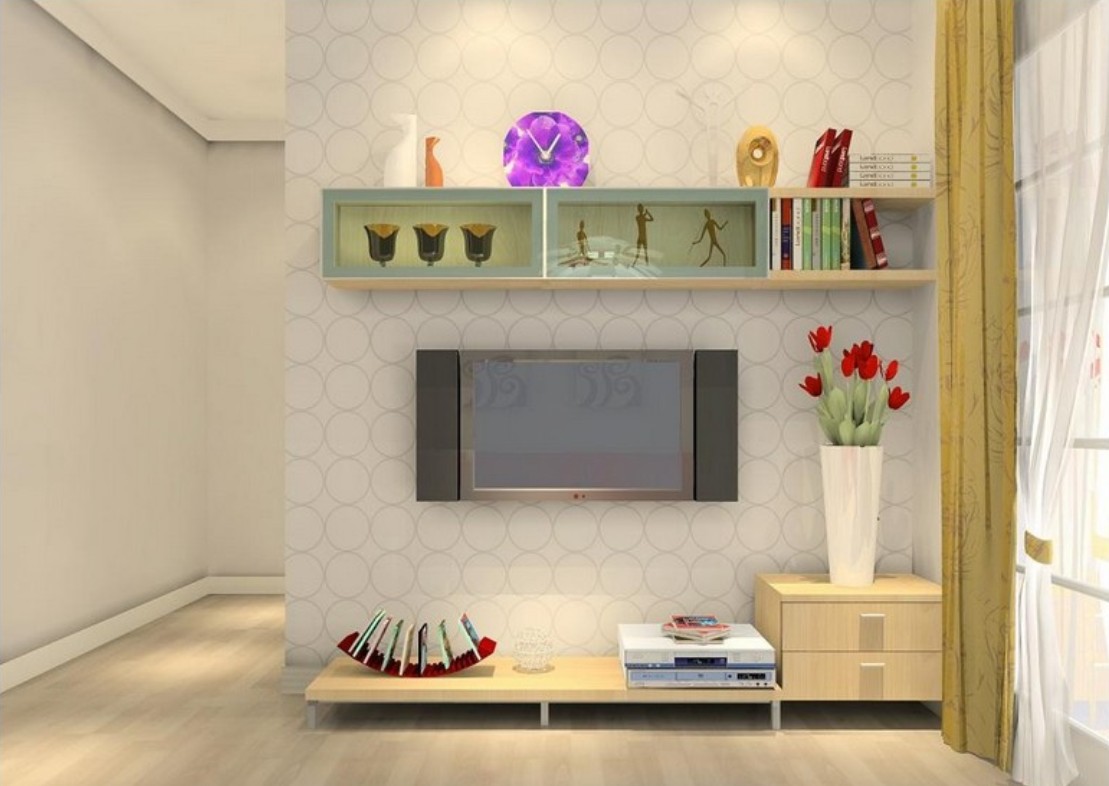 Description: A living room with a tv and a shelf with vases and books on it and a vase with flowers.