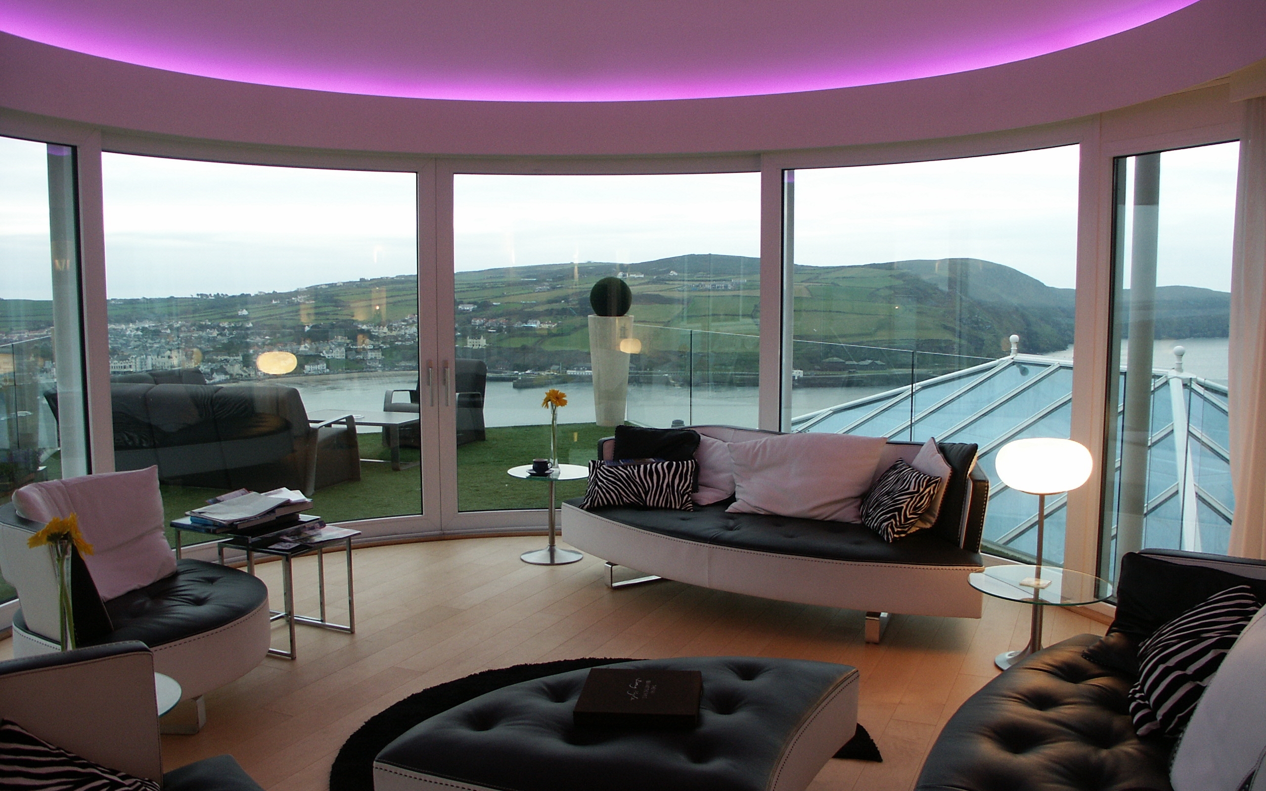 Description: A living room with a large window and a view of the water outside of it and a couch and chair.