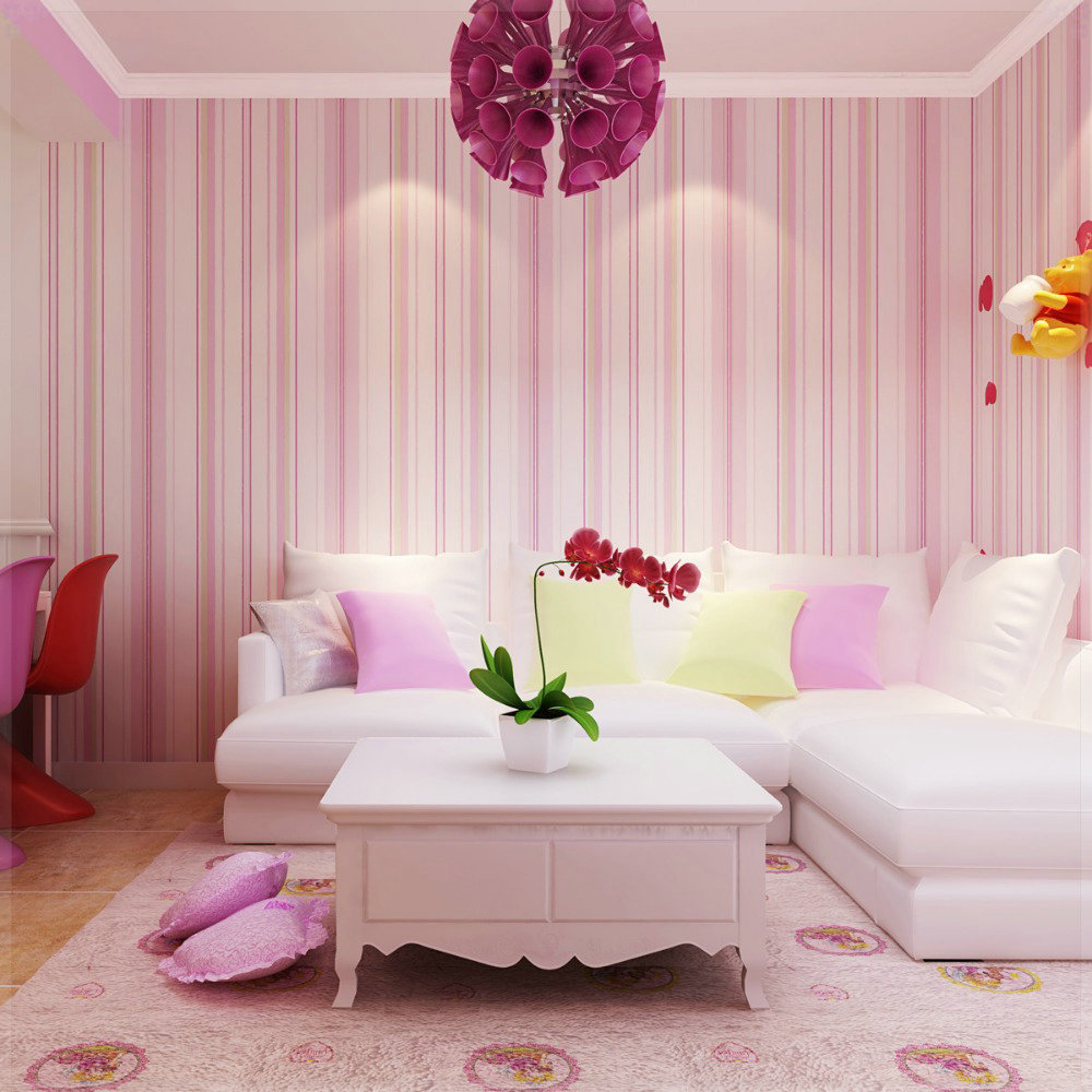 Description: A living room with a white couch and a table with flowers on it and a pink wallpapered wall.