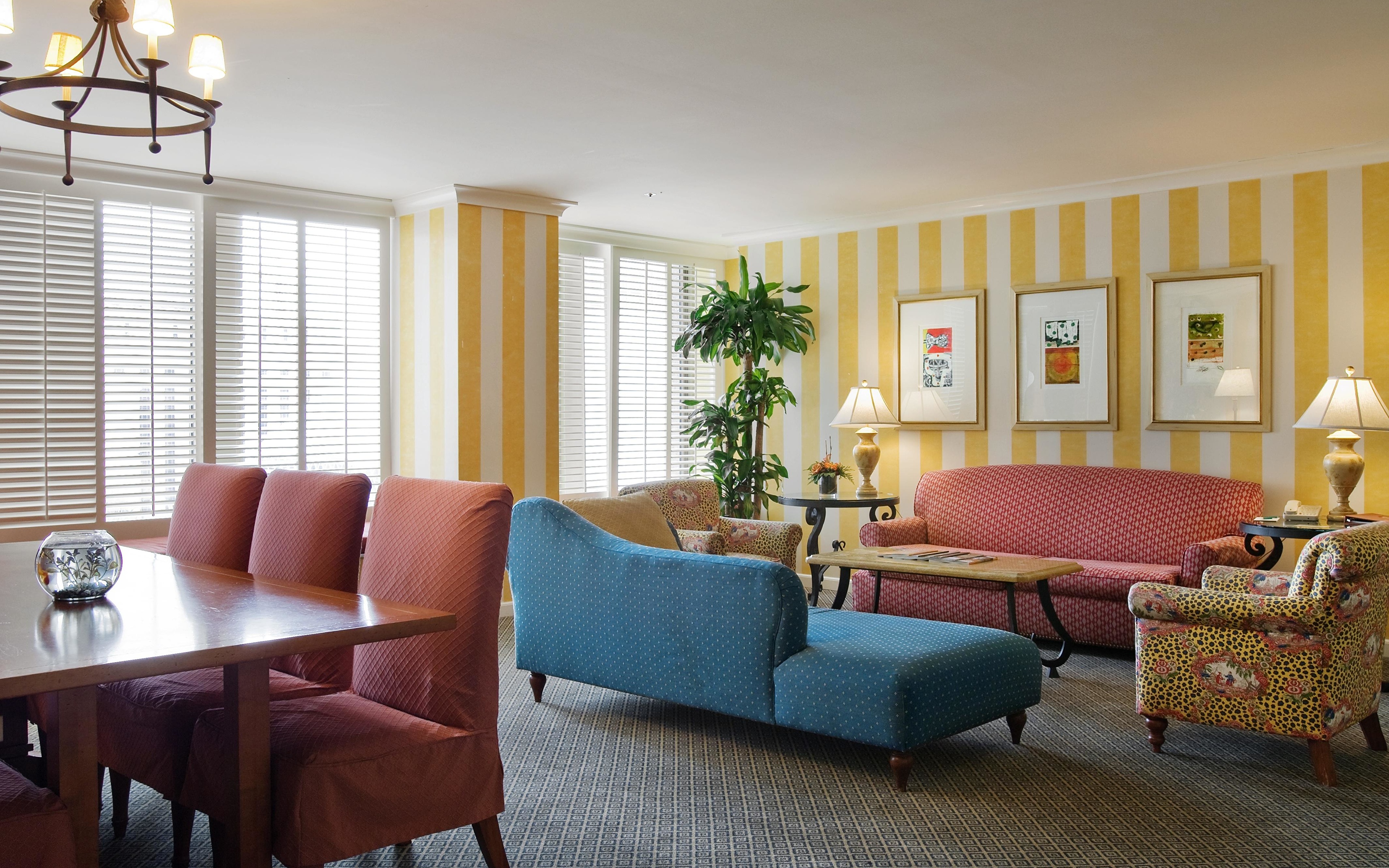 Description: A living room with a lot of furniture and a big window with blinds on it's sides and a table with chairs.