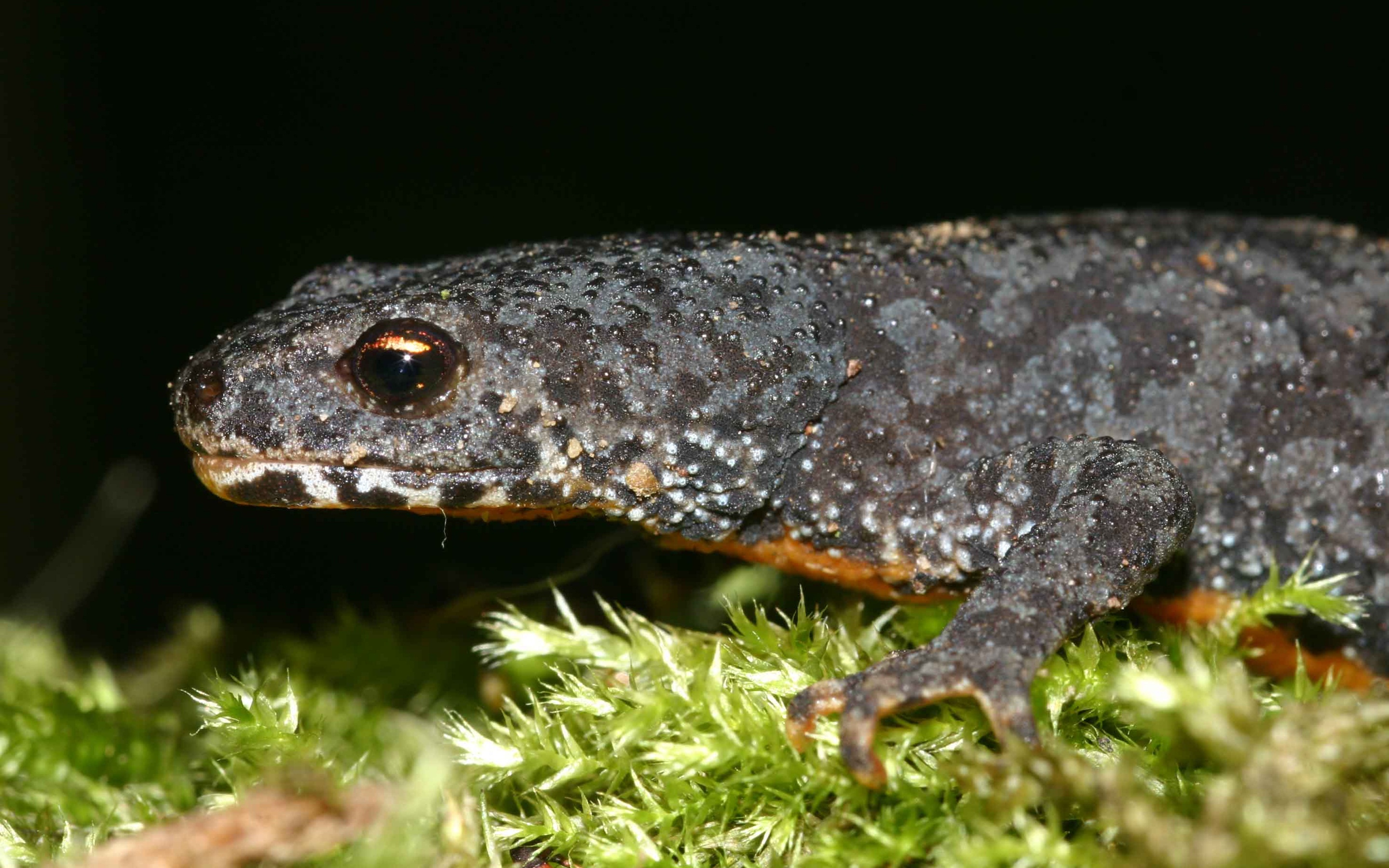 Description: A close up of a small lizard on a mossy surface with a black background and a small light shining on the top of the lizard.