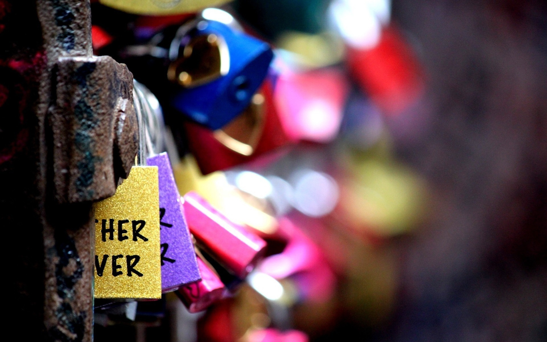 Description: A bunch of locks are attached to a wall with a sign that says her over it and a yellow tag that says her over it.