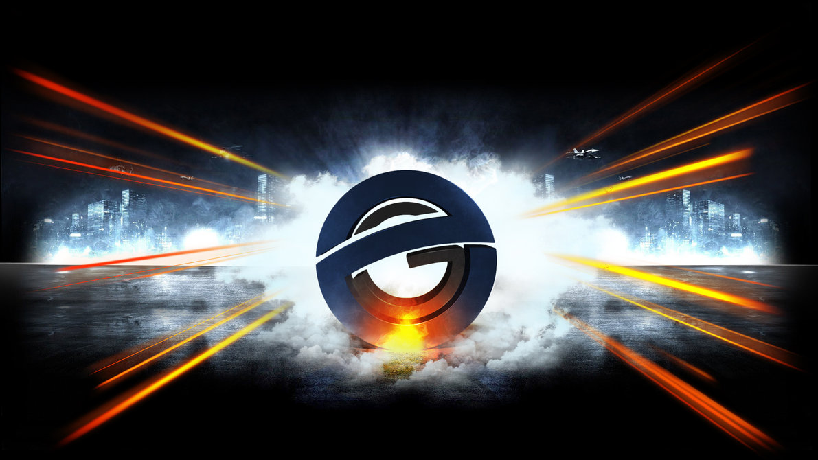 Description: A picture of a logo with a lot of light streaks around it and a black background with a white and blue logo.