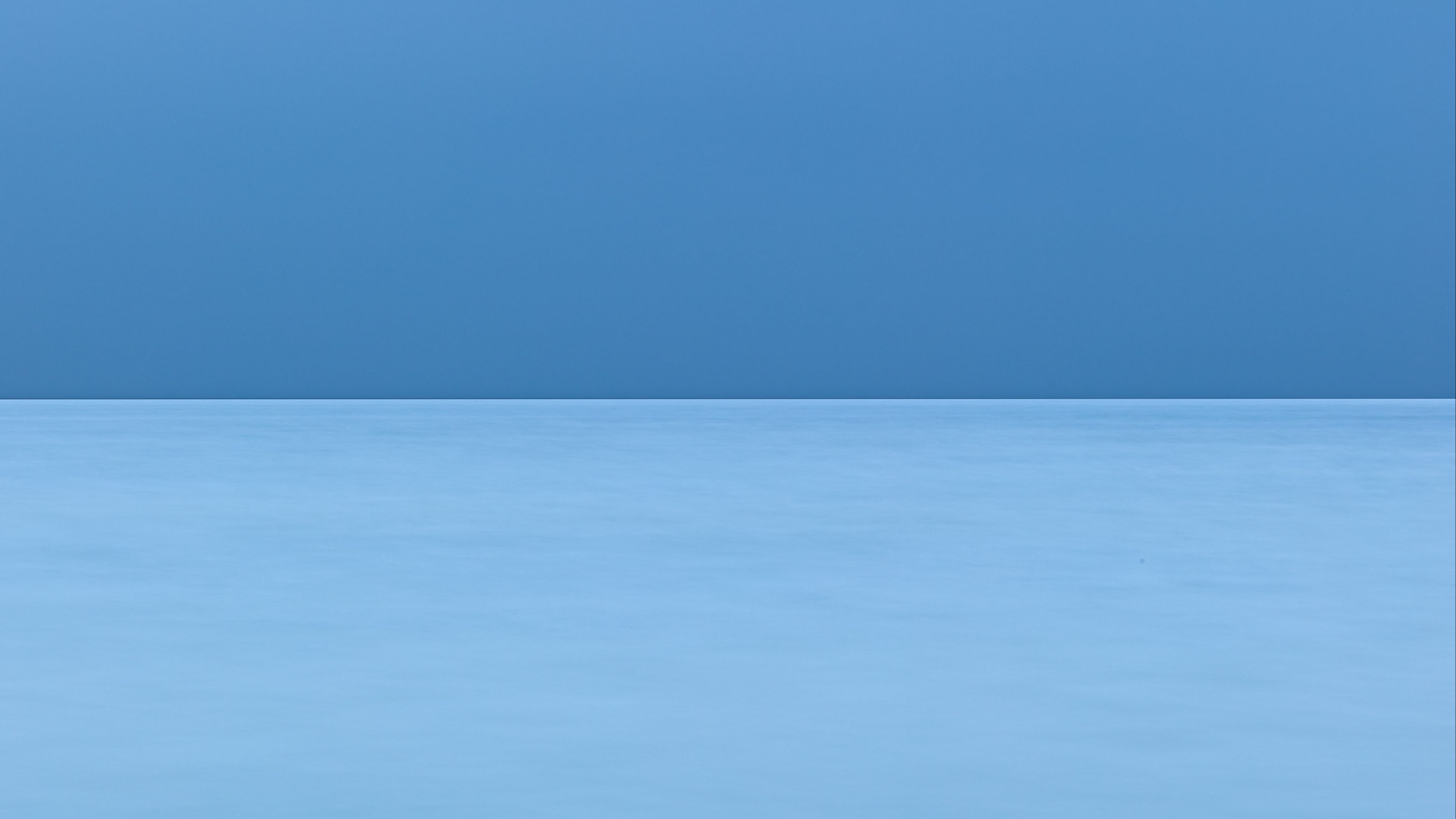 Description: A lone bird standing on a blue surface with a sky background and a blue sky in the background.
