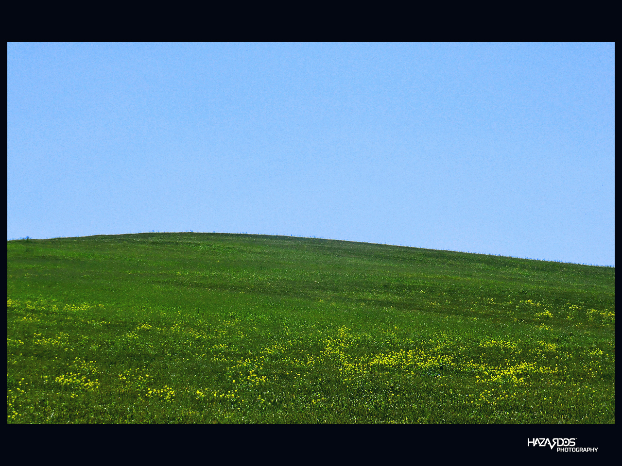 Description: A lone horse standing on a grassy hill side with a blue sky in the background and a few yellow flowers in the foreground.