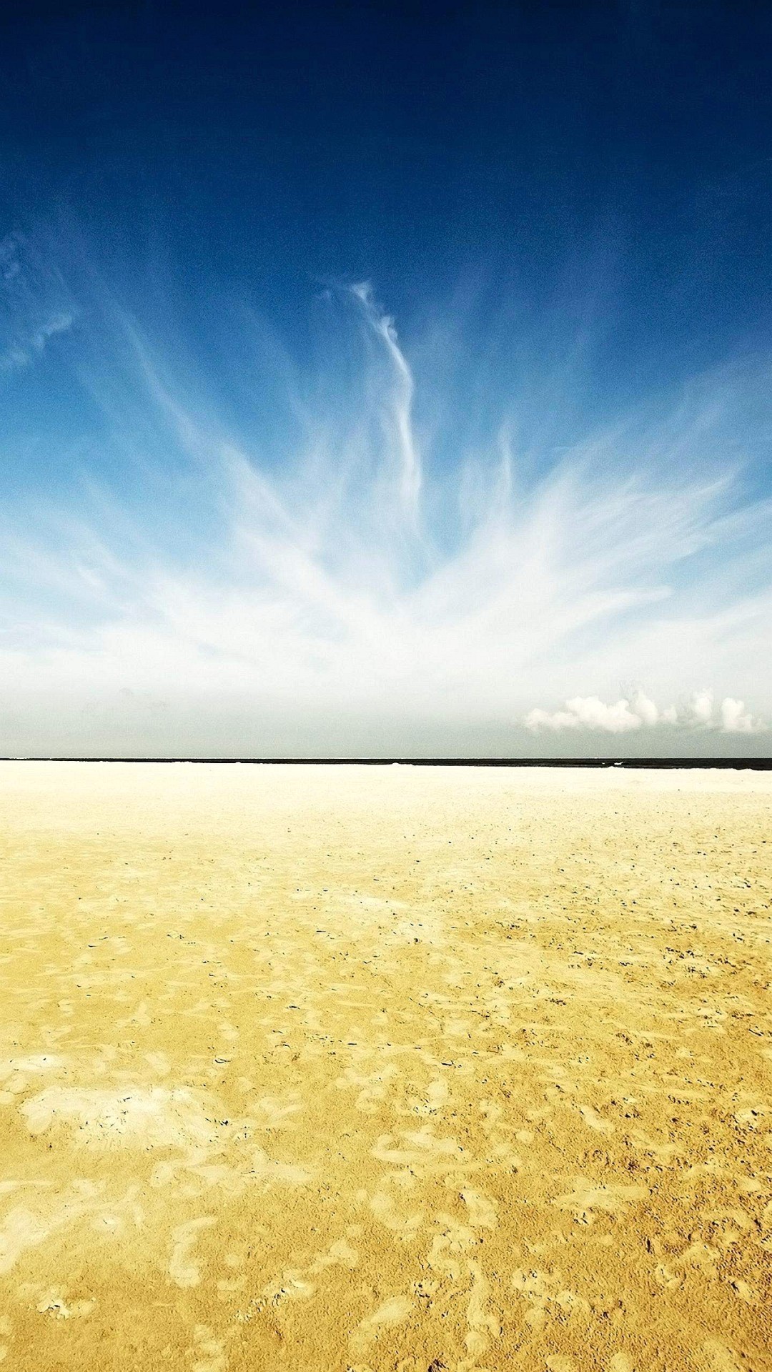 Description: A lone horse standing in a vast open field under a blue sky with clouds in the distance.