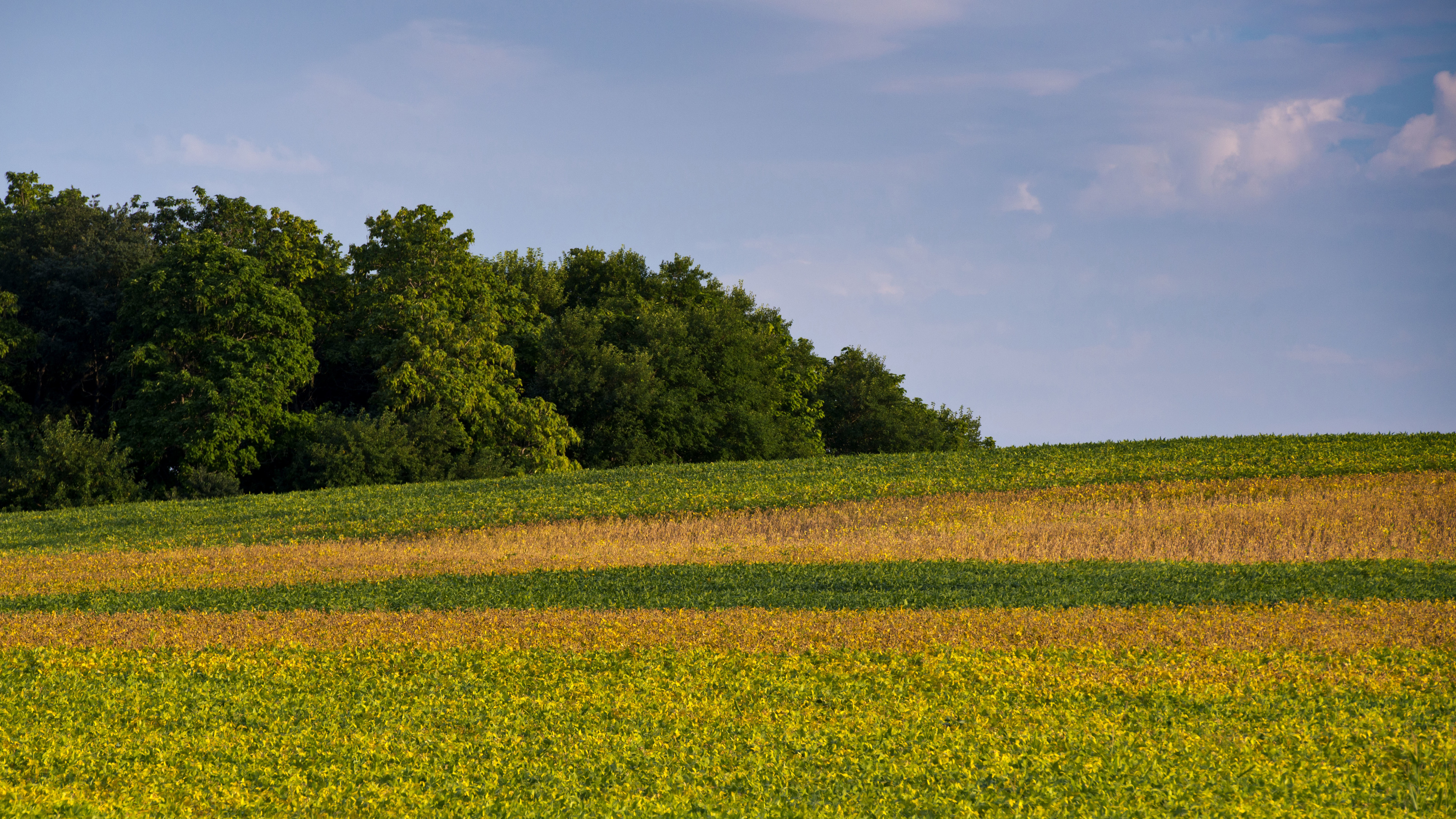 Description: A lone horse standing in a field of yellow flowers and trees in the background.