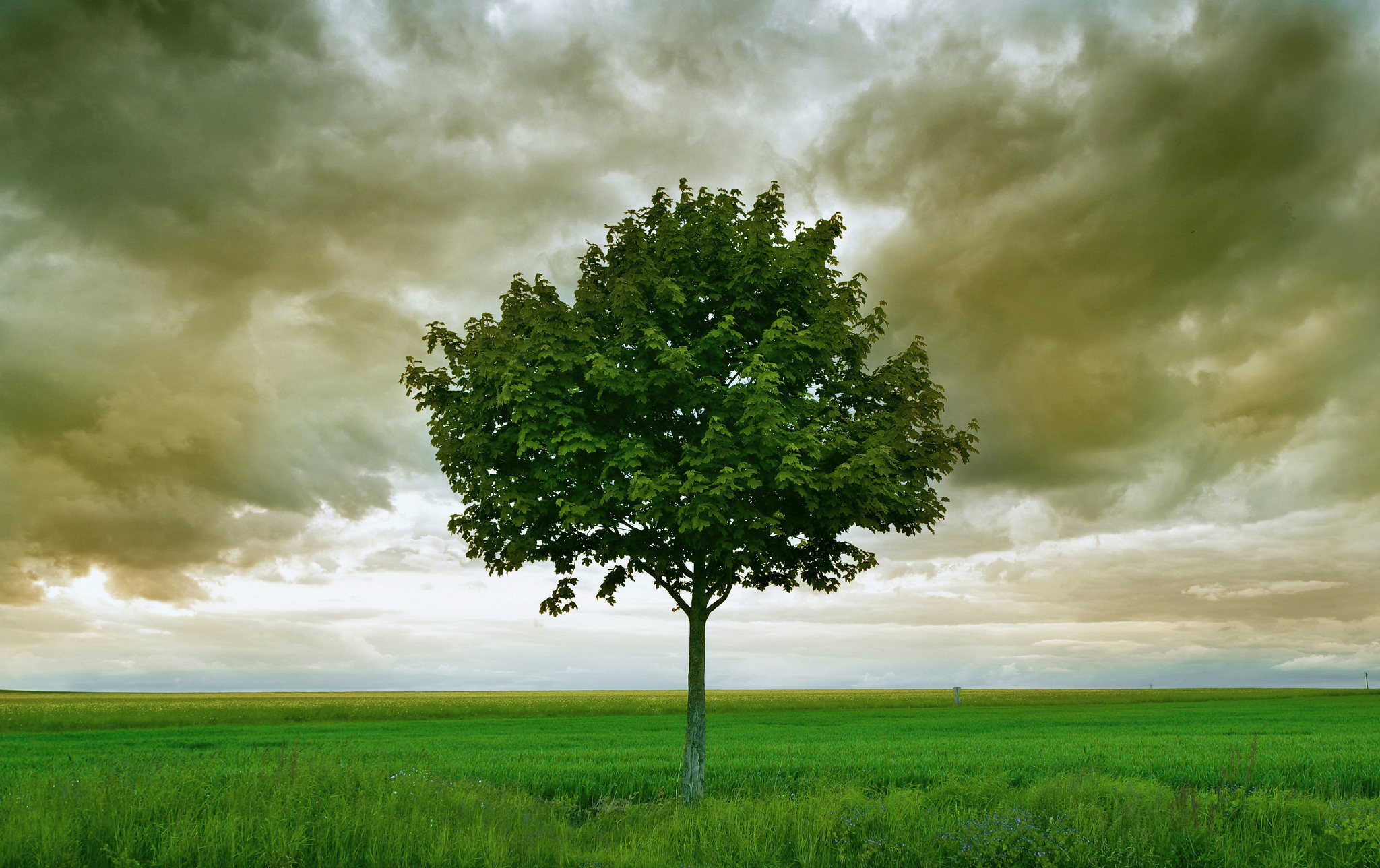 Description: A lone tree in a field under a cloudy sky with a green field below it and a green field below.