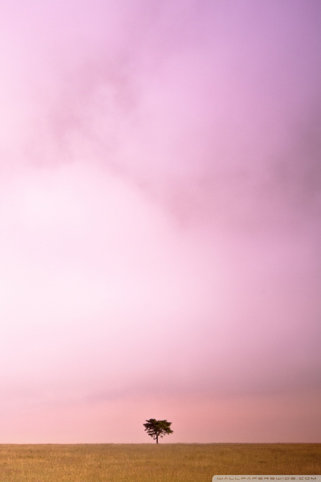 Description: A lone tree in a field of dry grass under a purple sky with clouds in the distance.