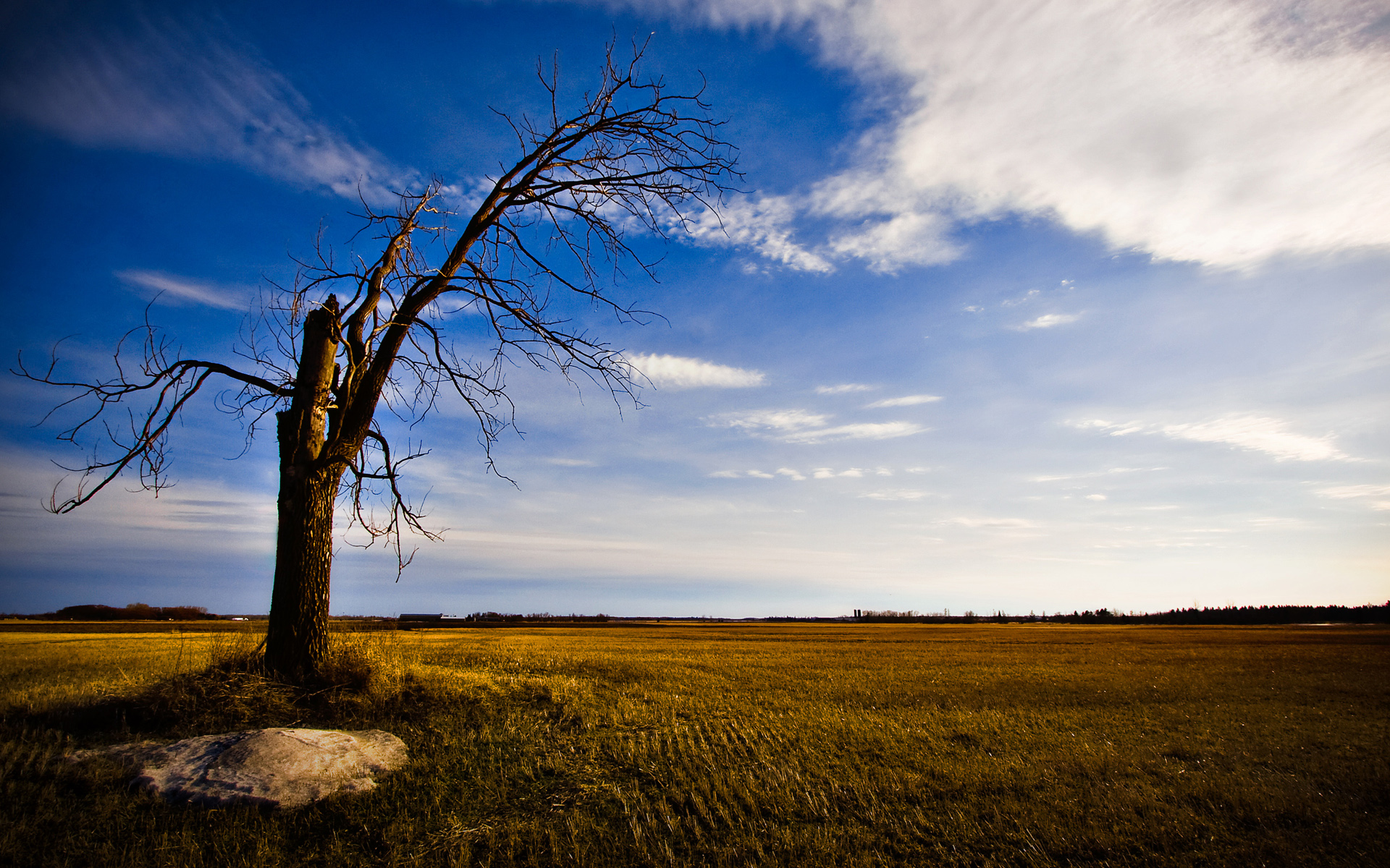 Description: A lone tree in a field with a blue sky in the background and clouds in the sky above it.