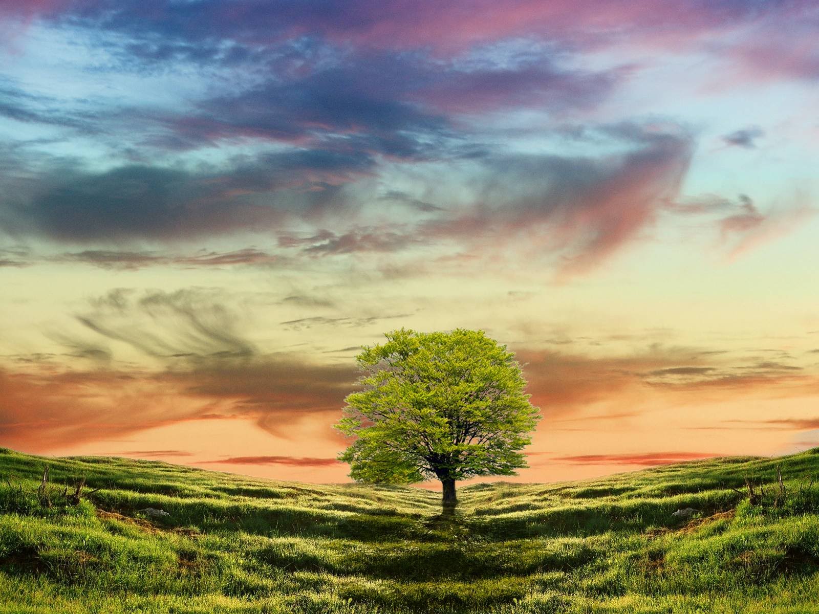 Description: A lone tree in a field with a sunset in the background and a pink sky in the background with clouds.