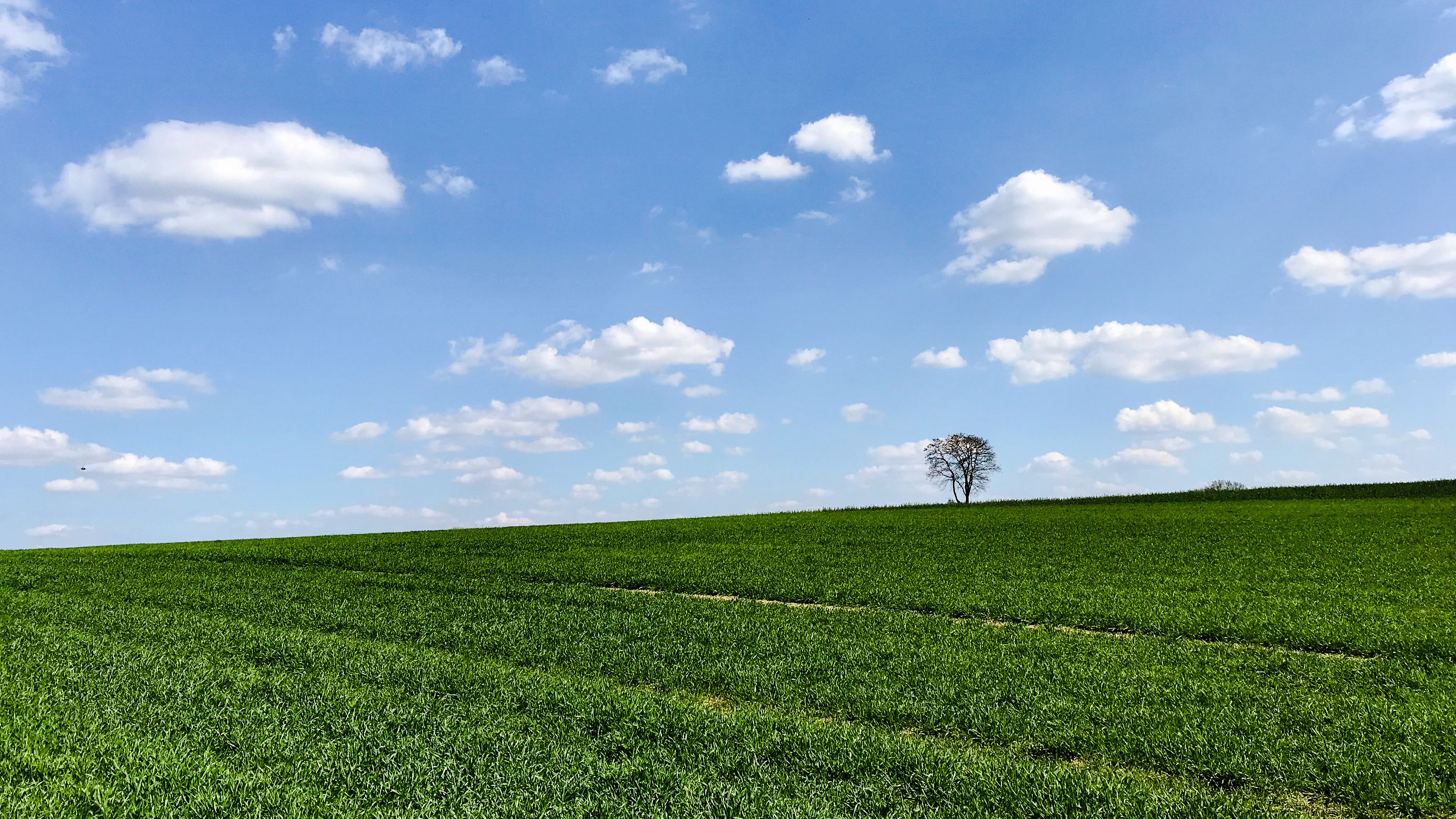 Description: A lone tree stands in the middle of a green field of grass with a blue sky in the background.