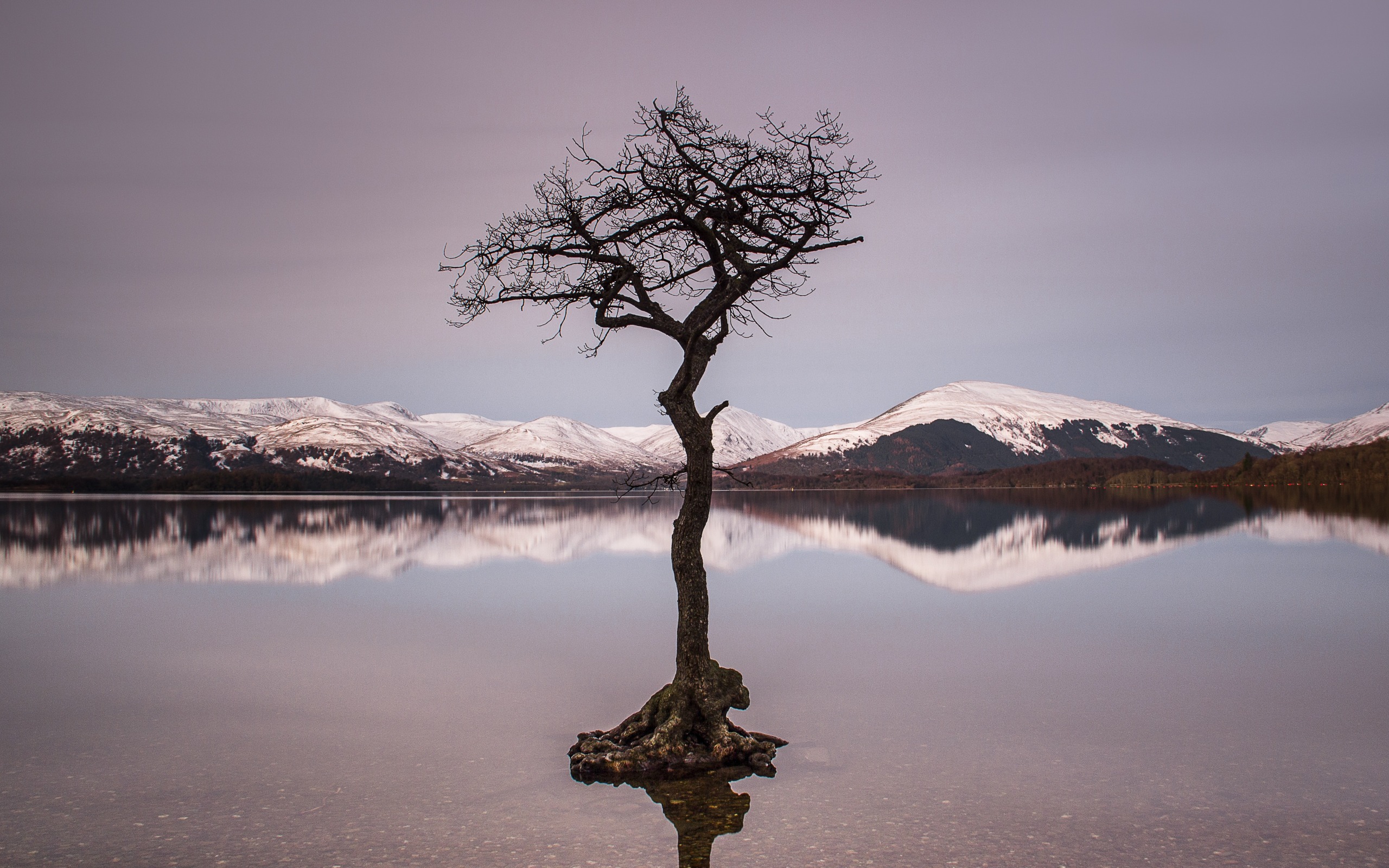 Description: A lone tree is standing in the middle of a lake with mountains in the background and a sky filled with clouds.