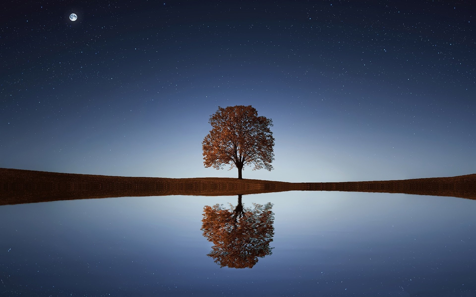 Description: A lone tree is reflected in a still lake at night with the moon in the sky above it and stars in the sky.