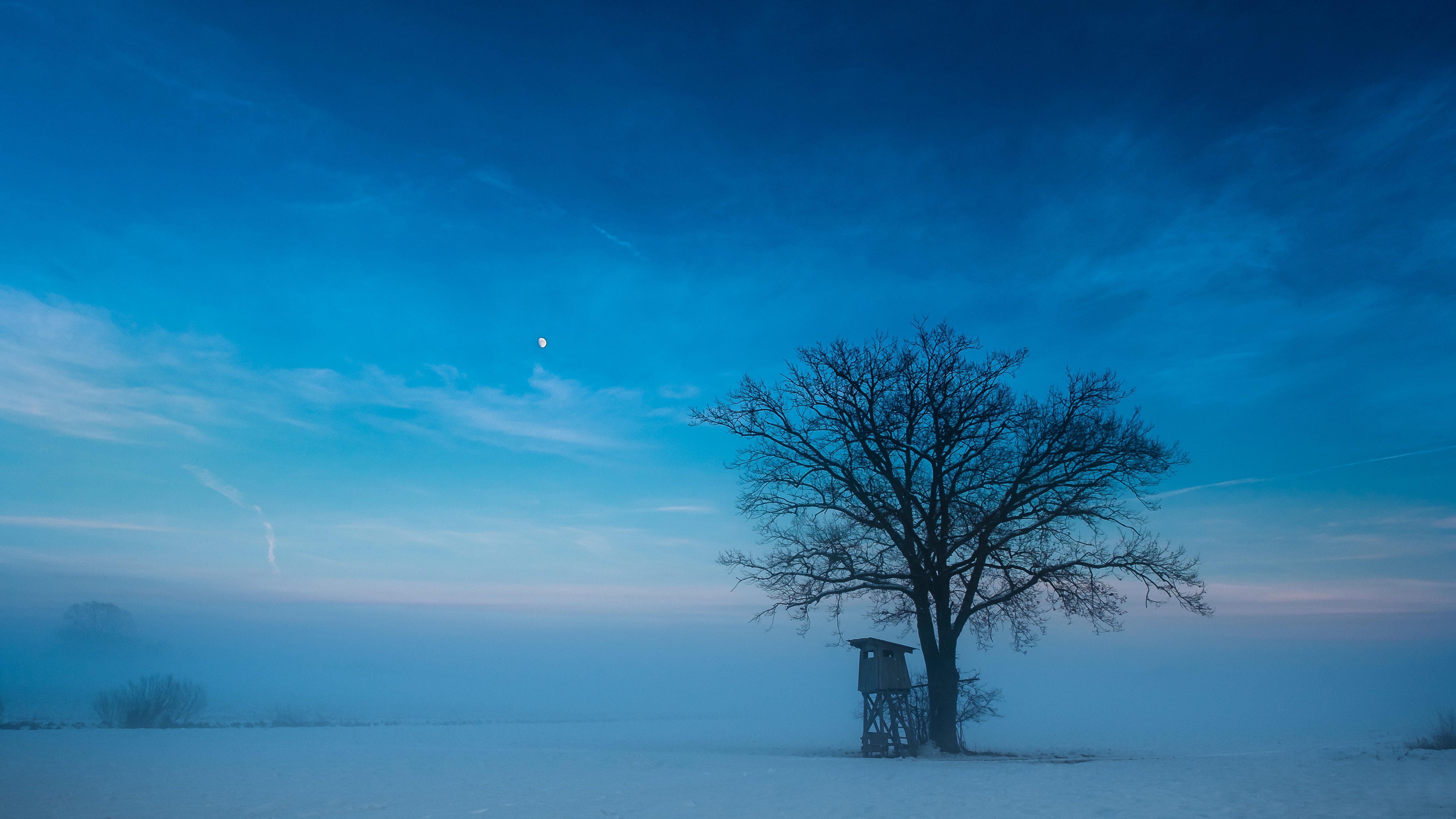 Description: A lone tree in a snowy field with a blue sky in the background and a lone bird in the distance.