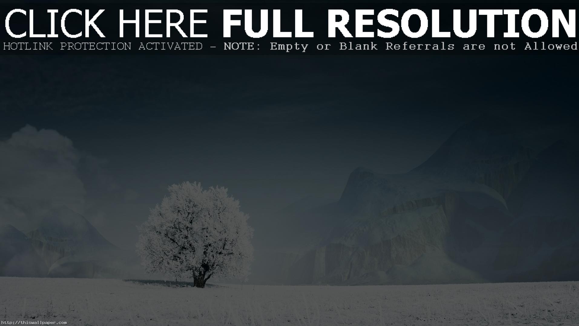 Description: A lone tree in a snowy field with a dark sky in the background with a caption below that reads.