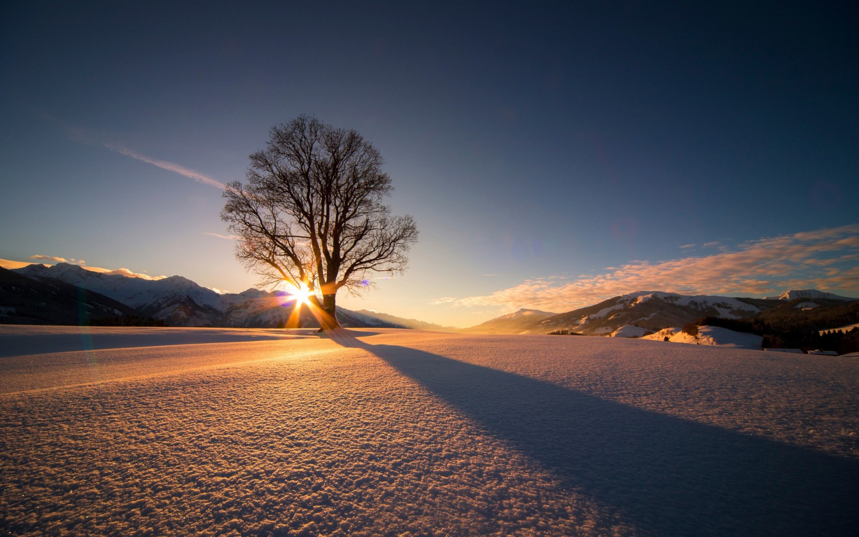 Description: A lone tree in the middle of a snowy field at sunset with the sun shining through the clouds and the sun shining through the trees.