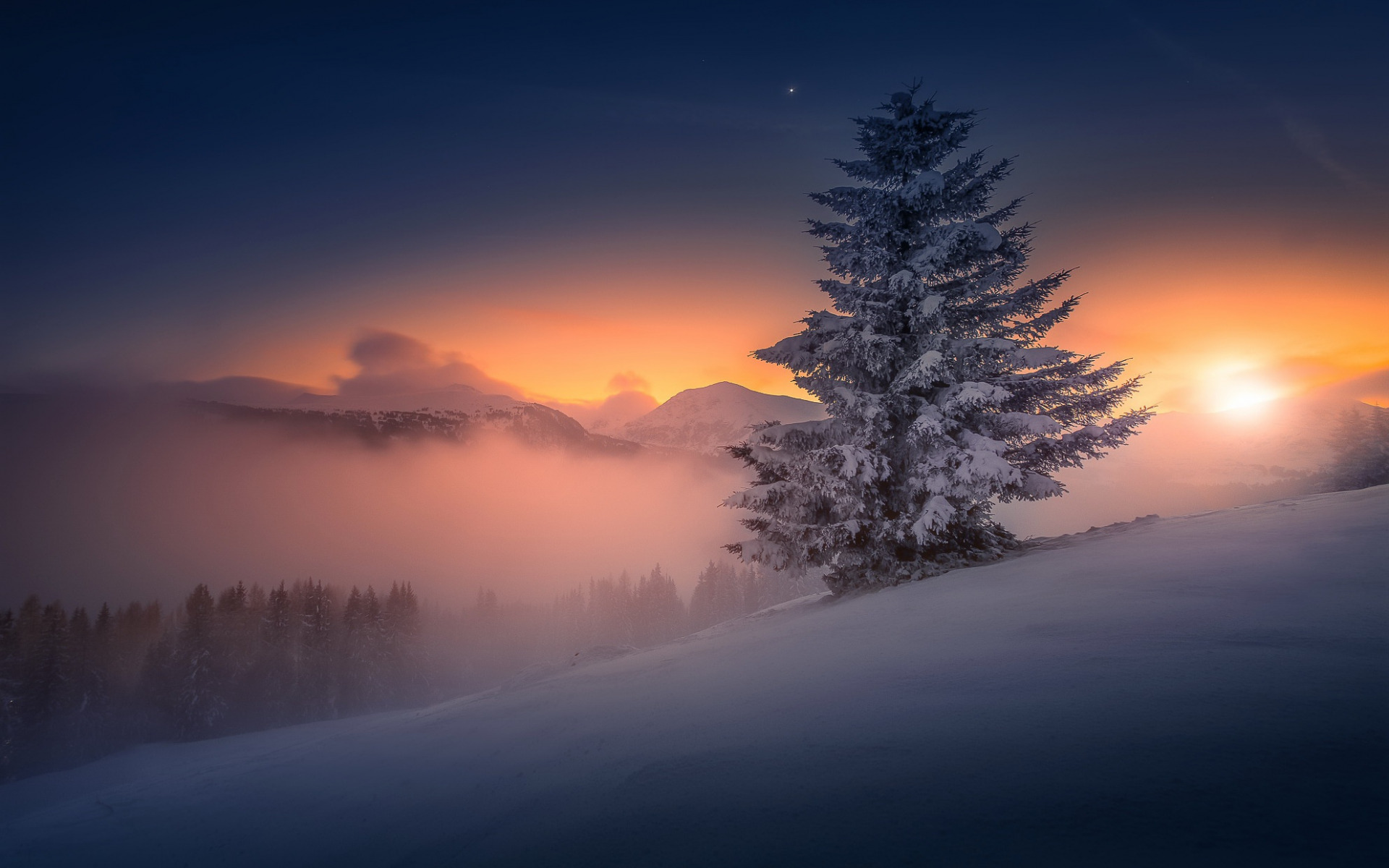 Description: A lone tree on a snowy hill at sunset with a foggy sky in the background and a sun setting.