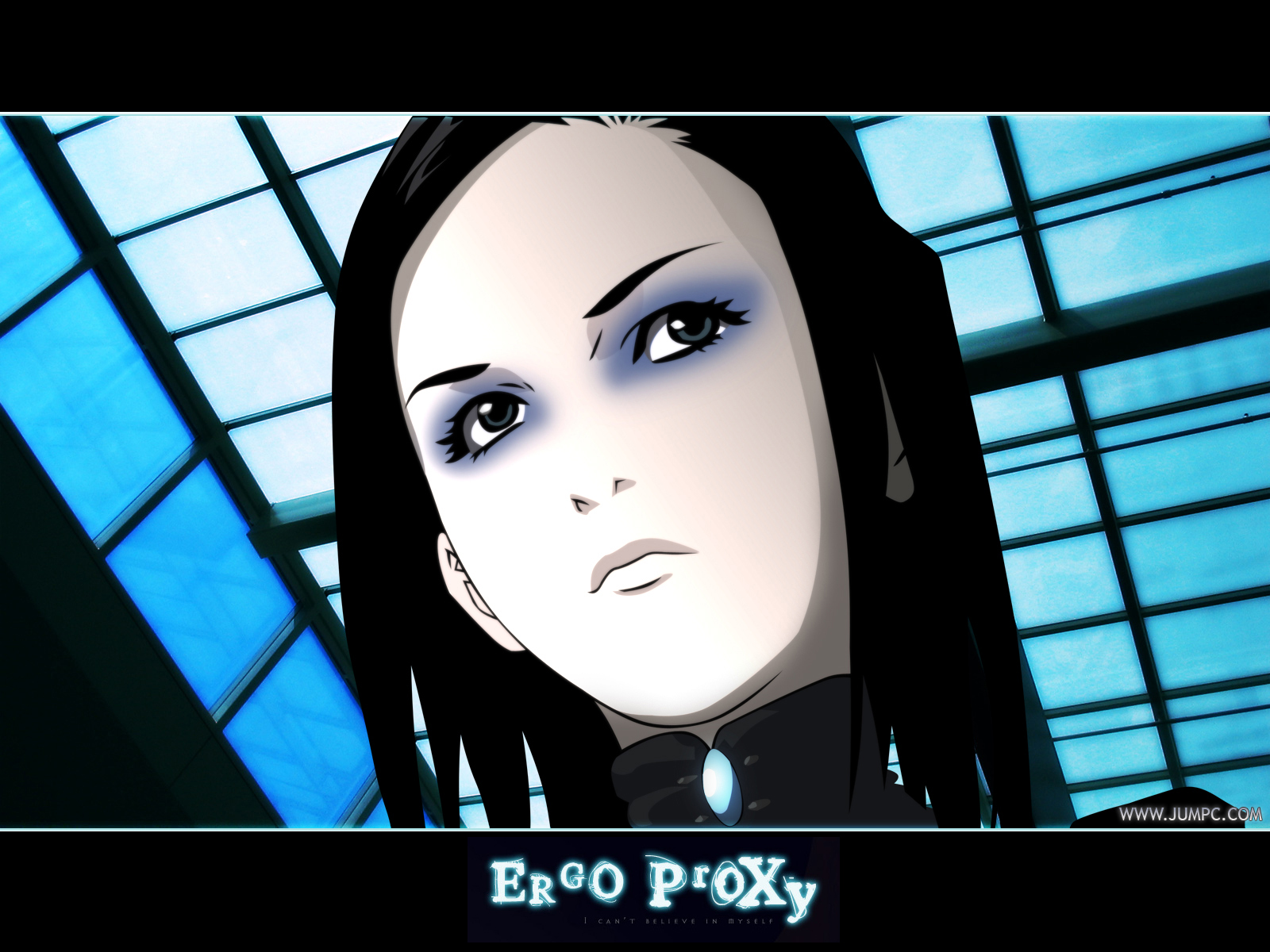 Description: A woman with long black hair and a black tie and a blue background with windows and a sign that says expo poxy.