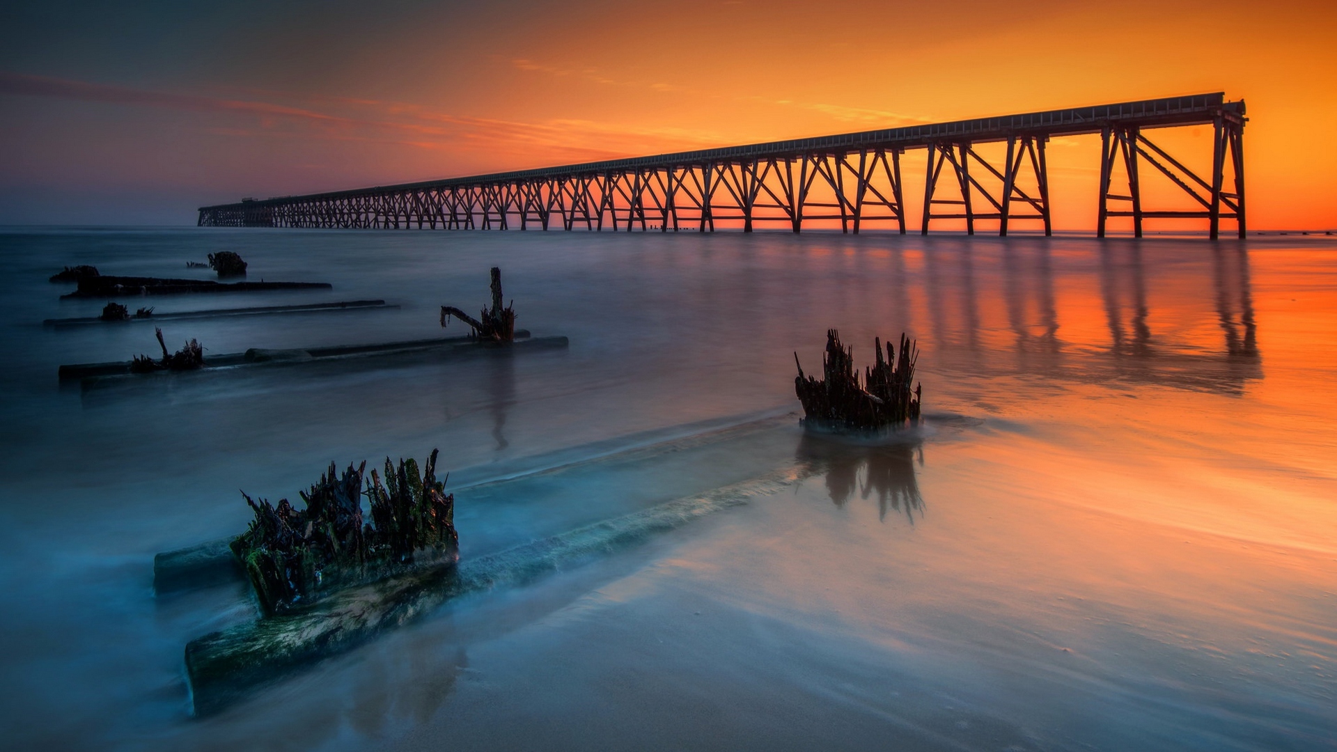 Description: A long bridge over water with a sky background and a few trees in the foreground and a few logs in the foreground.