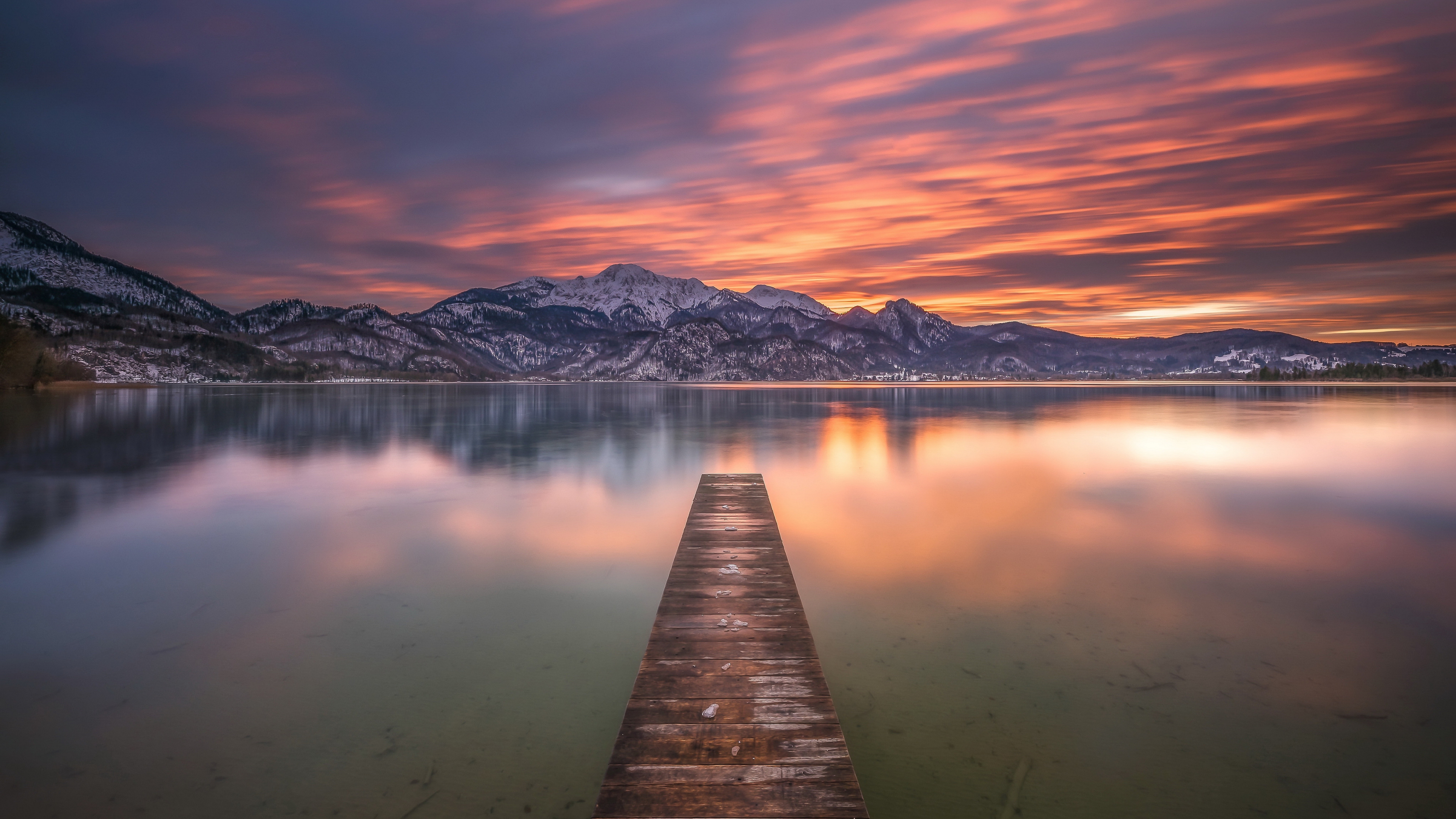 Description: A long dock is in the middle of a lake with mountains in the background at sunset or dawn with a colorful sky.